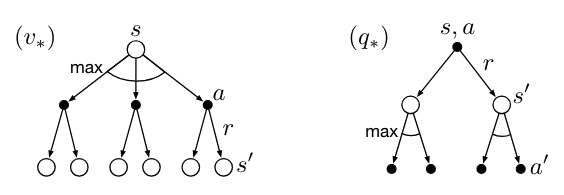\[\begin{split} \begin{align*} q_{\star}(s,a) &= E_{\pi_{\star}}[R_{t+1} + \gamma v_{\star}(s') | S_t=s, A_t=a] \\ &= \colorbox{lightyellow}{$ \underset{s', r}{\sum} p(s', r|s,a) [r+\gamma v_{\star}(s')] $}\\ &= \colorbox{lightyellow}{$ \underset{s', r}{\sum} p(s', r|s,a) [r+ \gamma \ \max_a q_{\star}(s',a')]$} \end{align*} \end{split}\]Similarly, the bellman optimality equation can be easily memorized with help of these two backup diagrams: