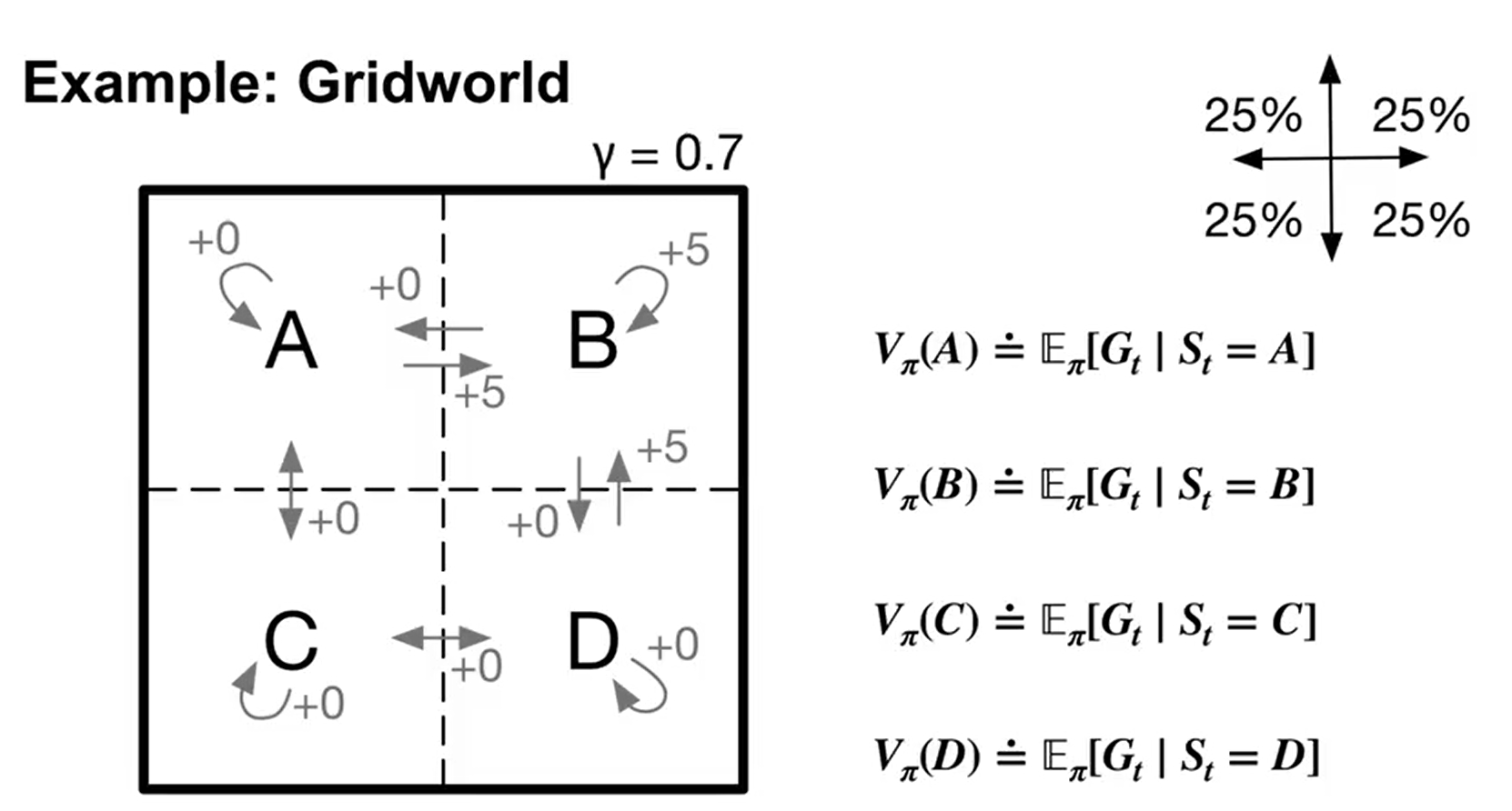 Value Function (of state \(s\)) under policy \(\pi\): is the expected return when starting in state \(s\) and following \(\pi\) thereafter: