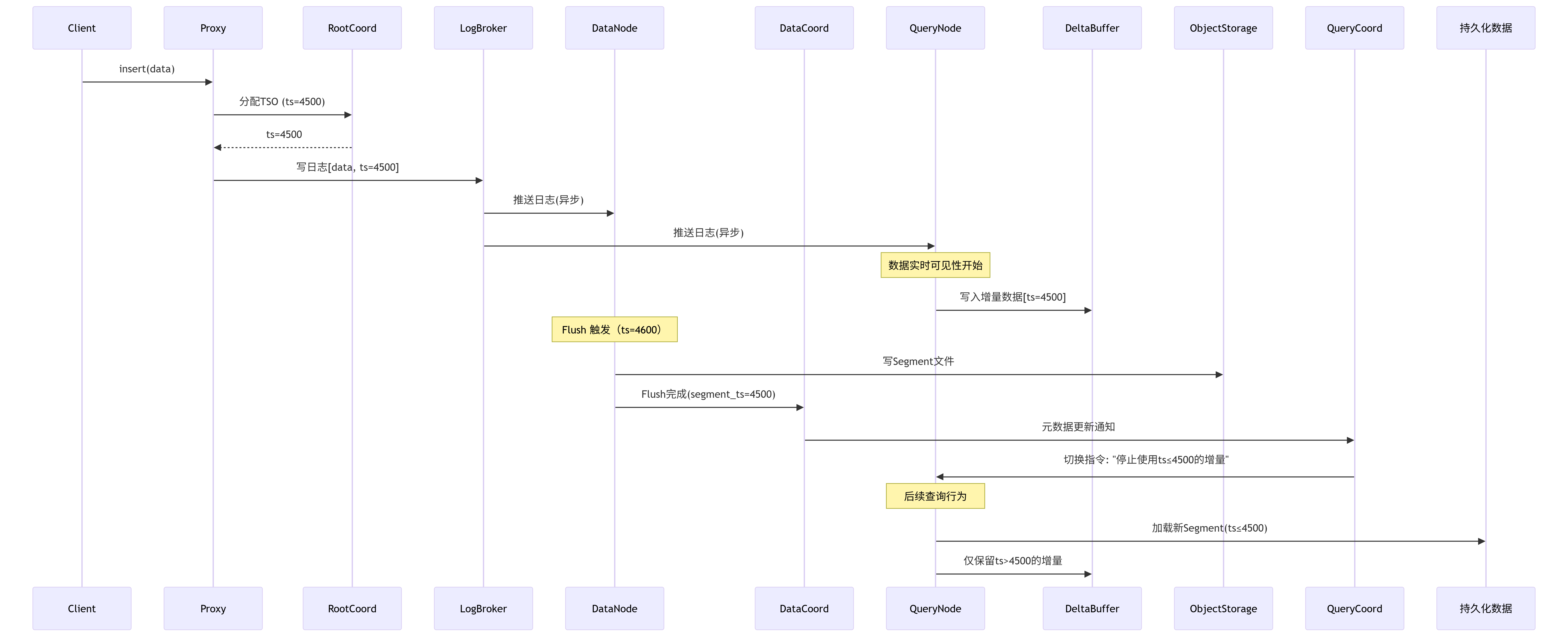 - 一致性模型:基于 Root Coord 分配的 TSO (Timestamp Oracle) 实现 快照隔离 (Snapshot Isolation)。查询看到的是其开始时刻确定的快照视图,写入按全局顺序提交。