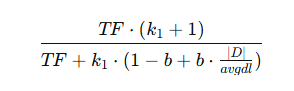 BM25是一个评分函数,它结合了TF-IDF的思想,但通过引入非线性词频饱和和文档长度归一化来解决上述局限性。BM25的完整公式(通常是BM25的TF部分与IDF部分的乘积)如下: