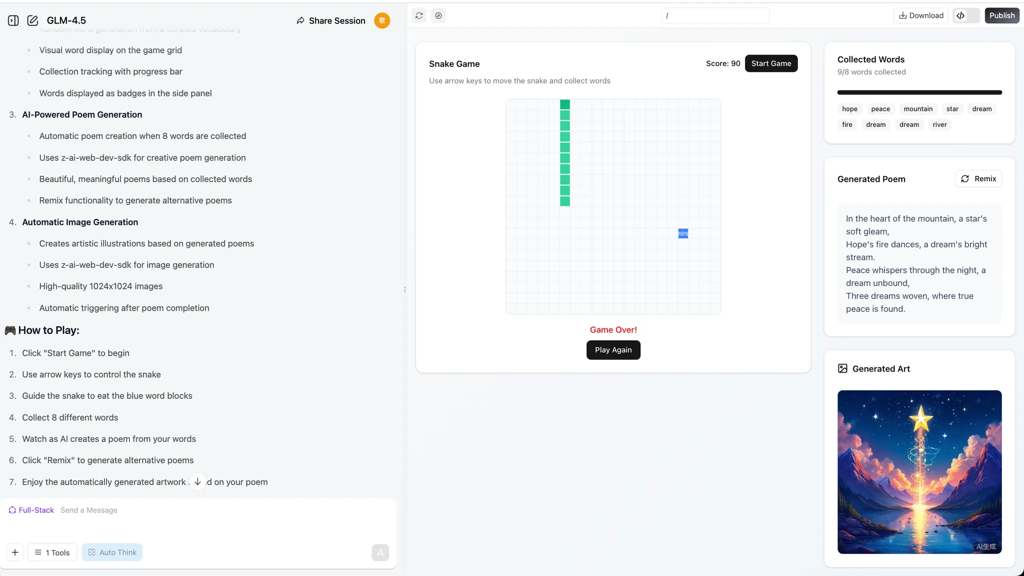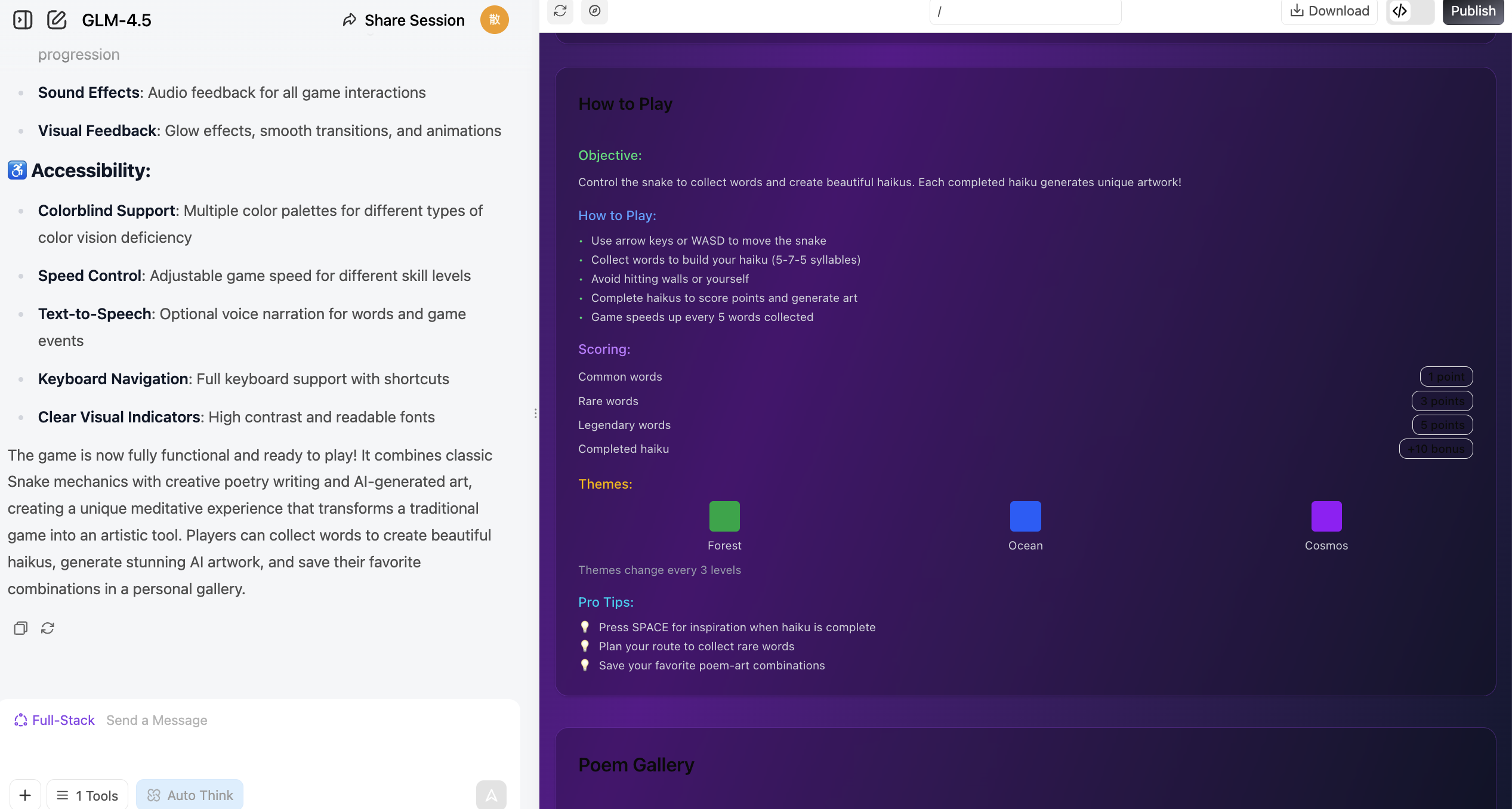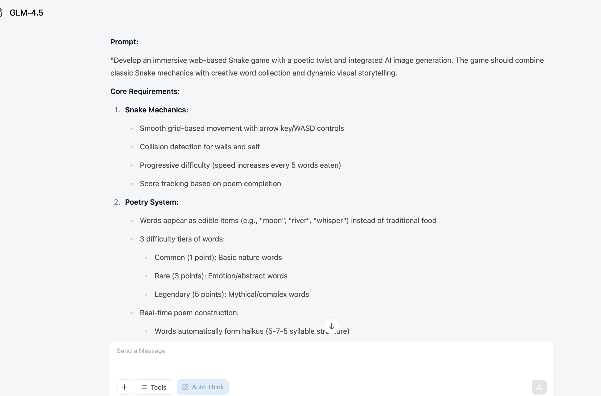 随着蛇的成长,LLM 生成一个连续的故事诗,图像模型创建一个无缝的长卷或全景图,所以玩家同时在“写作、绘画和玩耍”。此外,我们还可以要求 LLM 帮你直接生成项目级的提示词。在上一节中,我们只自己写了贪吃蛇游戏的提示词。现在让我们尝试让大模型生成一个带有整体框架和实现路径的提示词(你可以直接用 z.ai 生成):