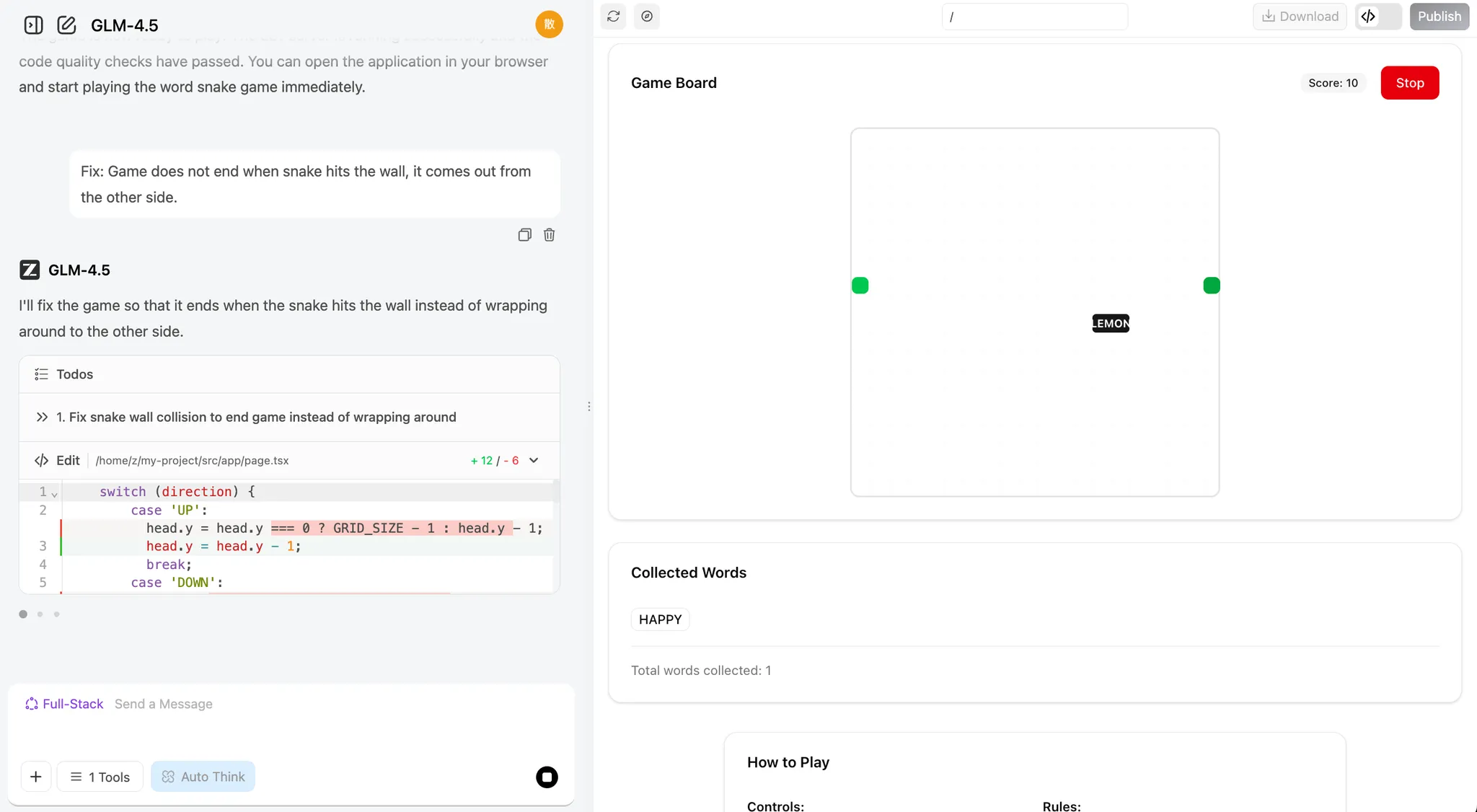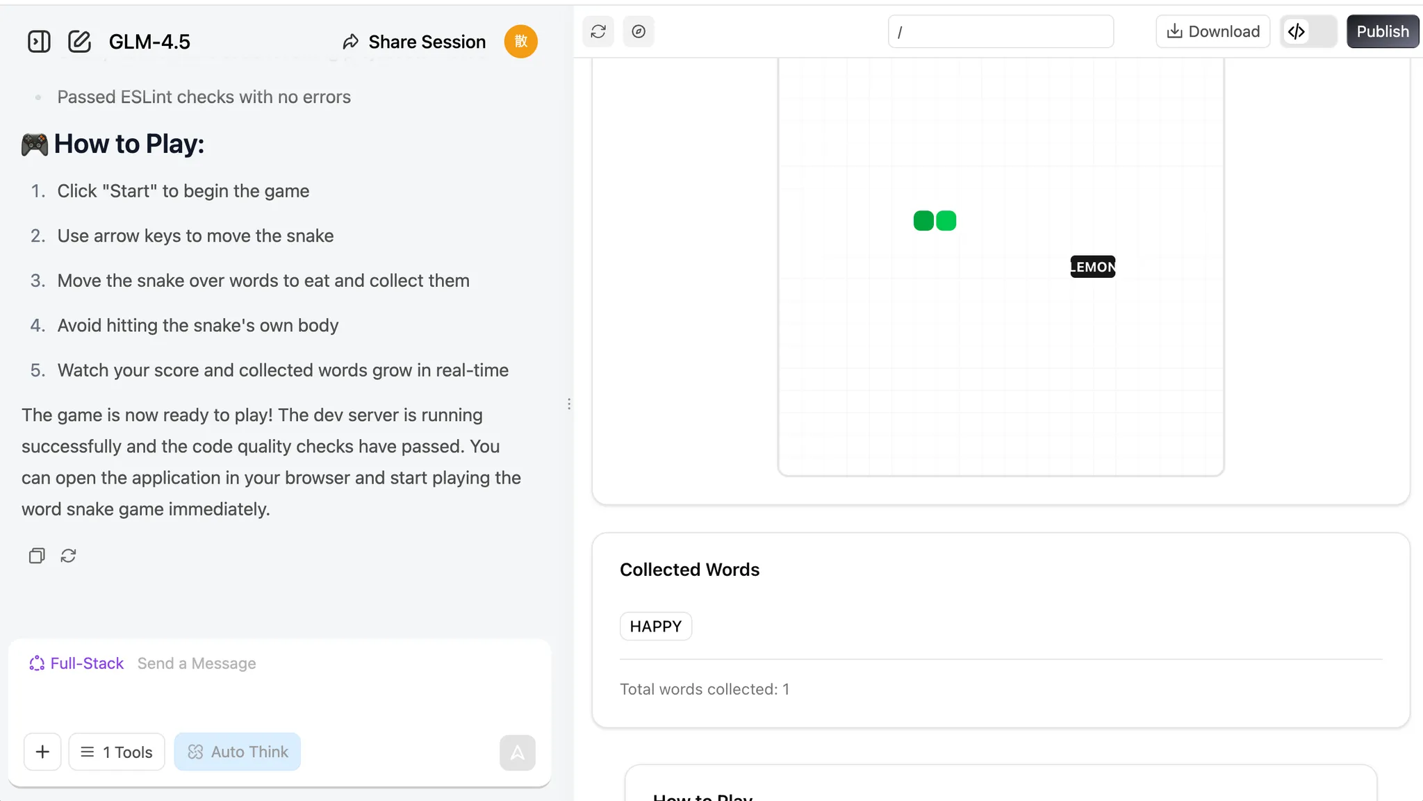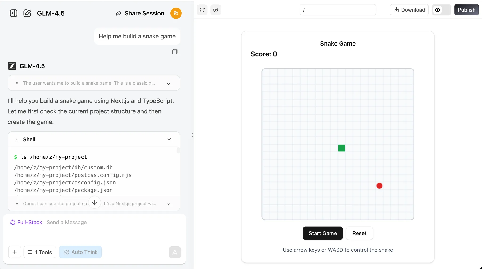 随着蛇的成长,LLM 生成一个连续的故事诗,图像模型创建一个无缝的长卷或全景图,所以玩家同时在“写作、绘画和玩耍”。此外,我们还可以要求 LLM 帮你直接生成项目级的提示词。在上一节中,我们只自己写了贪吃蛇游戏的提示词。现在让我们尝试让大模型生成一个带有整体框架和实现路径的提示词(你可以直接用 z.ai 生成):