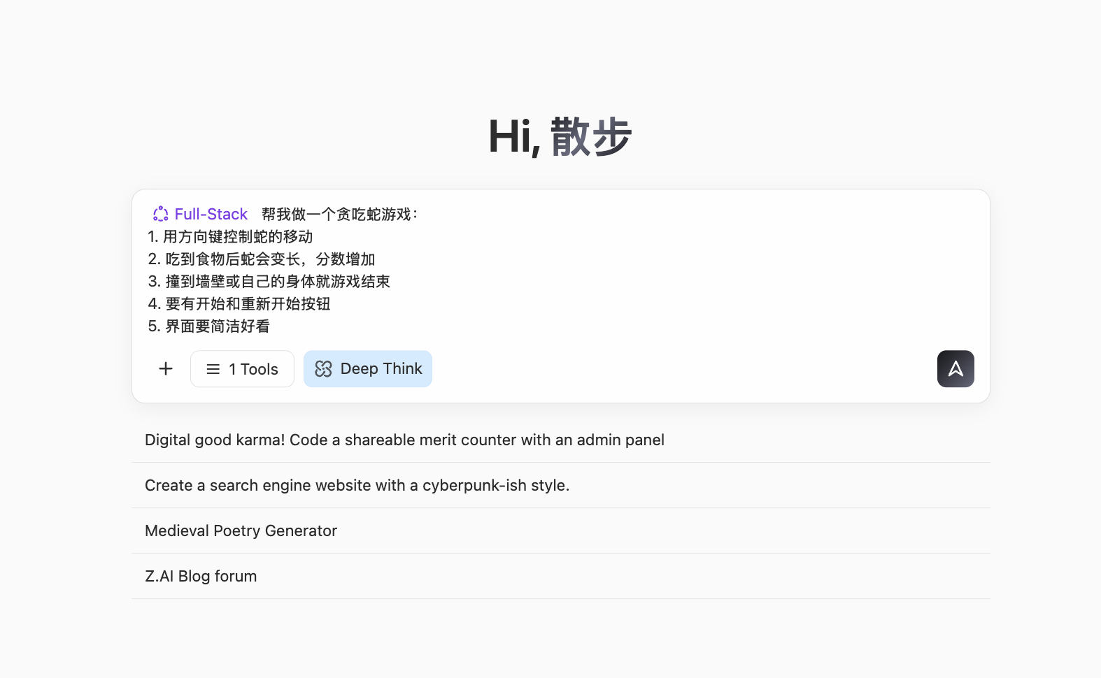 首先,请你打开课程中使用的实验网页 z.ai,z.ai 是由智谱 AI(中国领先的大语言模型公司之一)开发的 AI 平台,其核心能力由智谱自研的 GLM 系列大模型提供支持。该平台集成了多项 AI 功能,包括幻灯片生成、海报设计和全栈开发等。在本教程中,我们将重点介绍其全栈开发模块的使用。