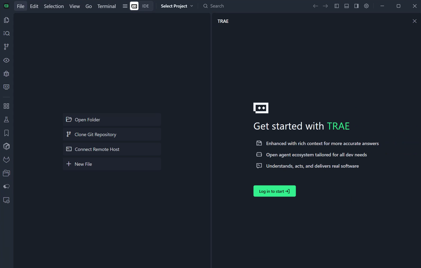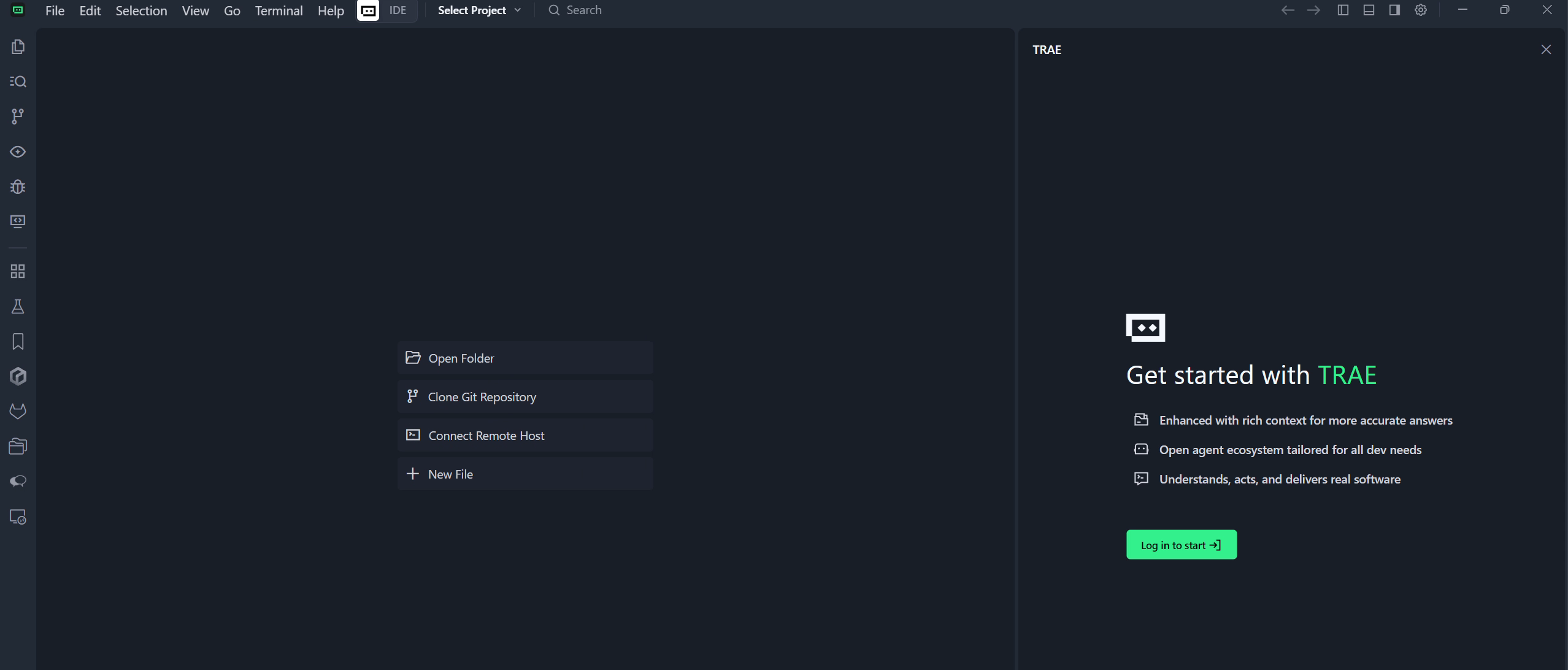 随后,打开已安装好的 AI IDE,在启动界面选择打开文件夹或Open Folder,将该空文件夹作为项目根目录导入;也可以直接将文件夹拖入 IDE 窗口完成打开。此时,左侧资源管理器中不会出现任何代码文件,表示我们正从一个完全空白的项目状态开始。