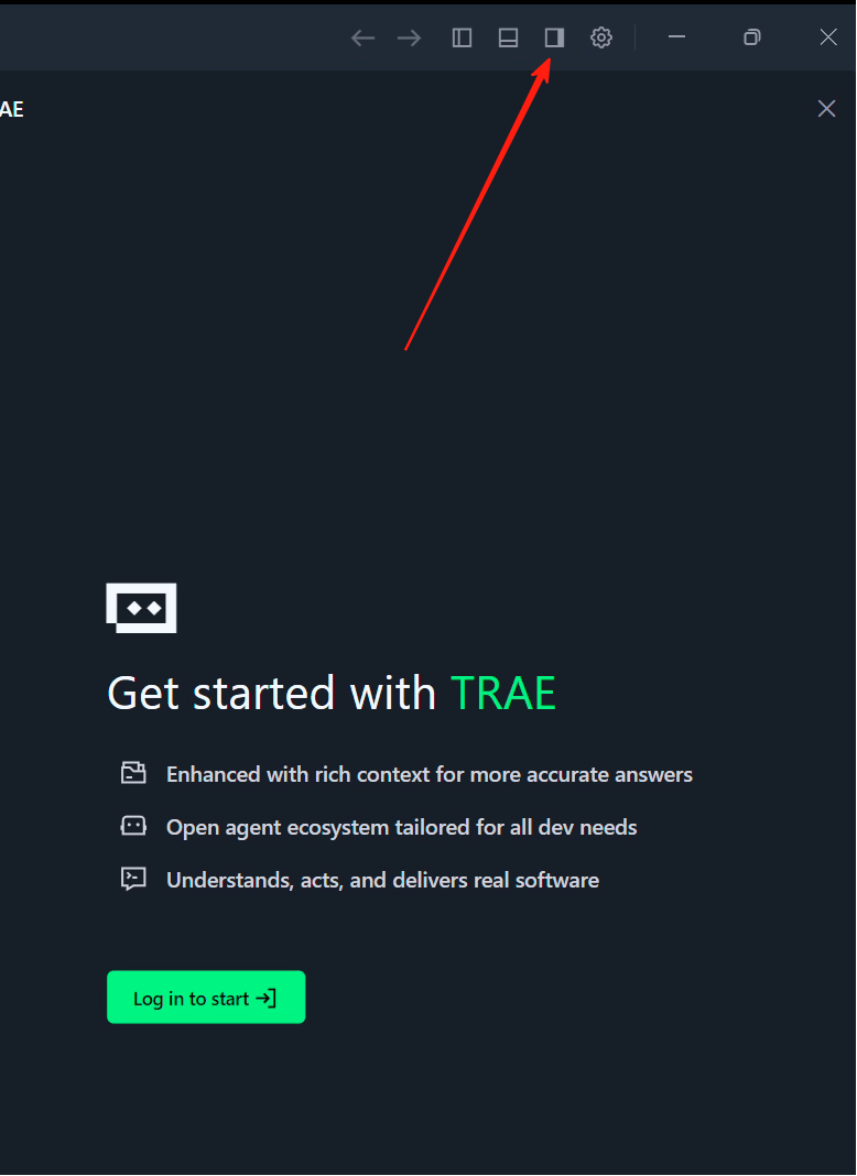 右侧的侧边栏就是 Copilot 交互窗口,也可以理解为 Agent 窗口。如果你暂时看不到它,可以点击 Trae 右上角的侧边栏图标将其打开。