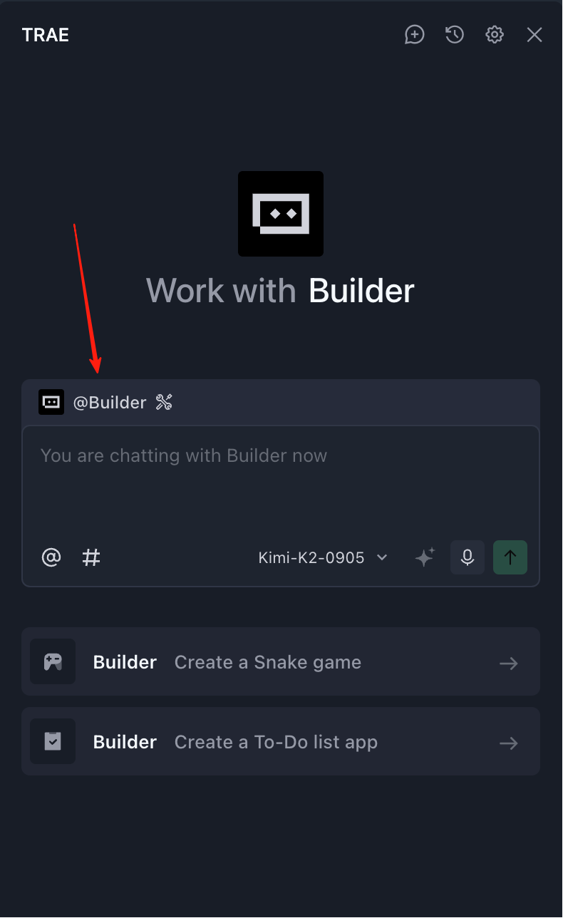 在下面的区域,你还会看到模型选择选项,点击即可修改当前使用的大模型。在中国版中,你可以选择使用 Kimi k2 或 GLM 等国内模型;如果你使用的是国际版 Trae,还可以选择 ChatGPT 或 Claude 等海外模型。不过,由于国内大模型发展非常快,Kimi、Qwen、GLM 等在很多任务上的实际体验已经接近 Claude 3.5 或 3.7,对日常开发来说已经完全够用,这里不强制要求使用国际版或者国内版进行操作。