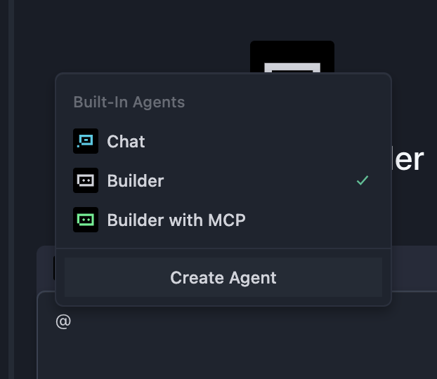 点击 “Builder” 后,你会看到 “Chat” 模式和 “Builder with MCP” 模式: