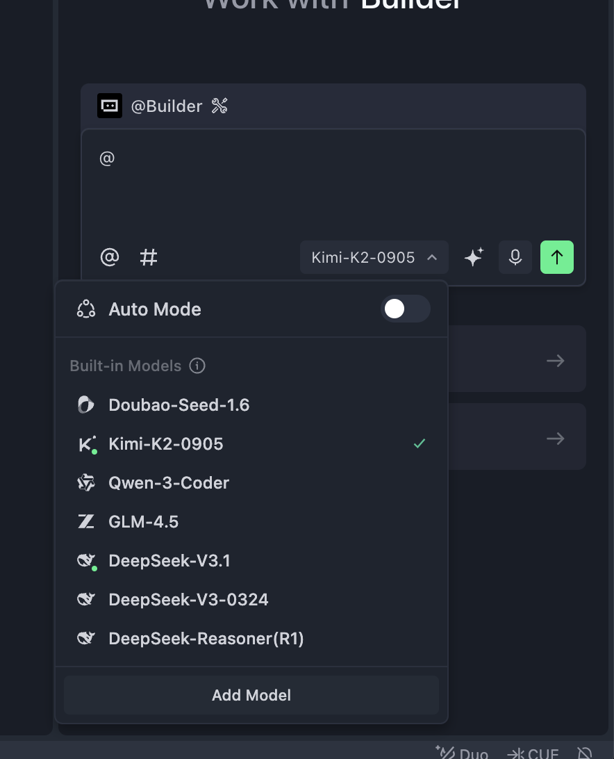 - Chat 模式:主要用于和当前文件夹里的代码对话,或者当作普通聊天模型来使用。(你可以通过左上角的 “File” 菜单打开一个文件夹,在这个文件夹中进行编辑操作。在这种情况下,Builder 创建或修改的文件都只会发生在这个文件夹内部。)