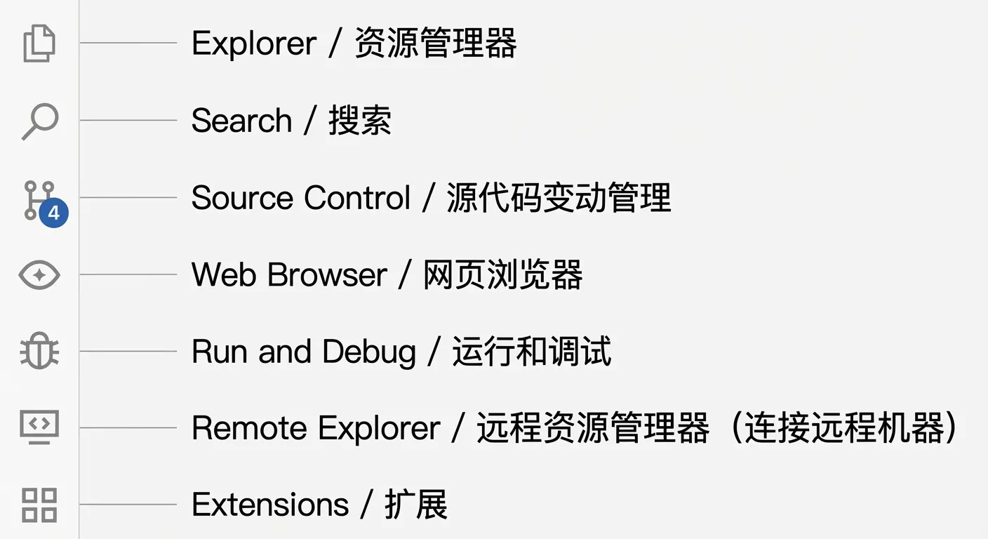 活动栏位于界面最左侧,以图标形式提供核心功能视图入口,用于切换左侧工具面板。常见图标与作用如下: