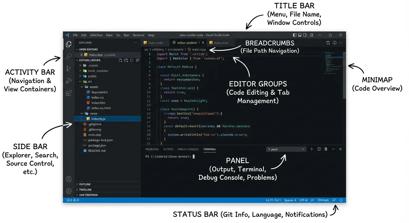 除此之外,现代 IDE 往往还内置版本控制工具(如 Git)和项目管理工具等实用功能。当下最流行的 IDE 之一是微软出品的 Visual Studio Code (VS Code)。它轻量、可扩展性极强,因此被广泛使用。当然,也有很多开发者推荐 JetBrains 家的专业 IDE,比如用于 Python 的 PyCharm、用于 C/C++ 的 CLion 等,它们对特定语言提供了更深入、更完整的支持。但从入门友好度和通用性角度出发,我们更推荐初学者优先选择 VS Code 作为主要开发工具。