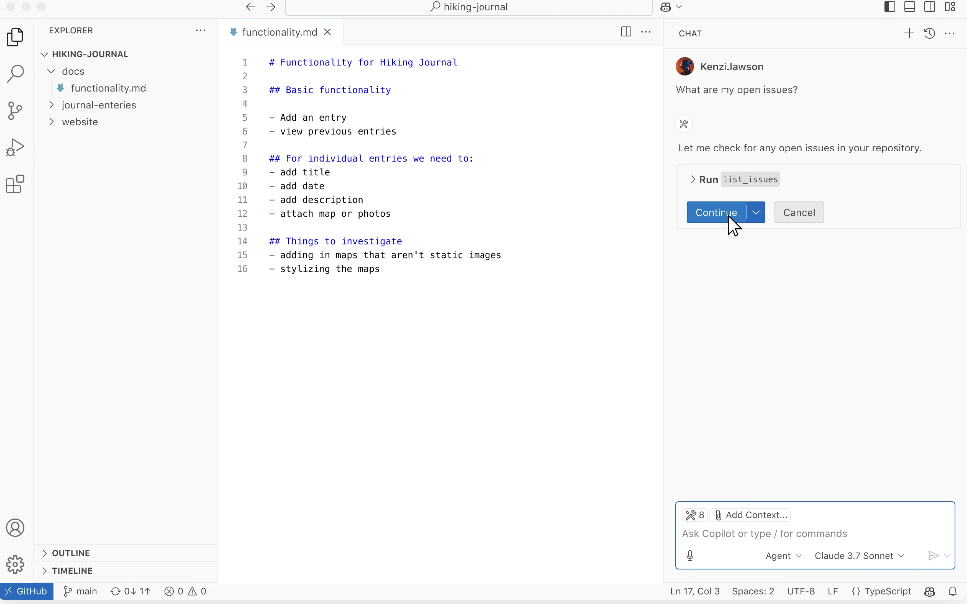 在最新版 VS Code 中,已经内置了一个大语言模型助手。你可以直接针对整个代码仓库、某个文件,甚至某个函数与模型对话。你也可以像之前在 Web 端使用自动写代码工具一样,将需求以提示词的形式发给内置的编码 Agent,让它自动帮你实现所需功能、创建文件、修改代码、配置环境等。
