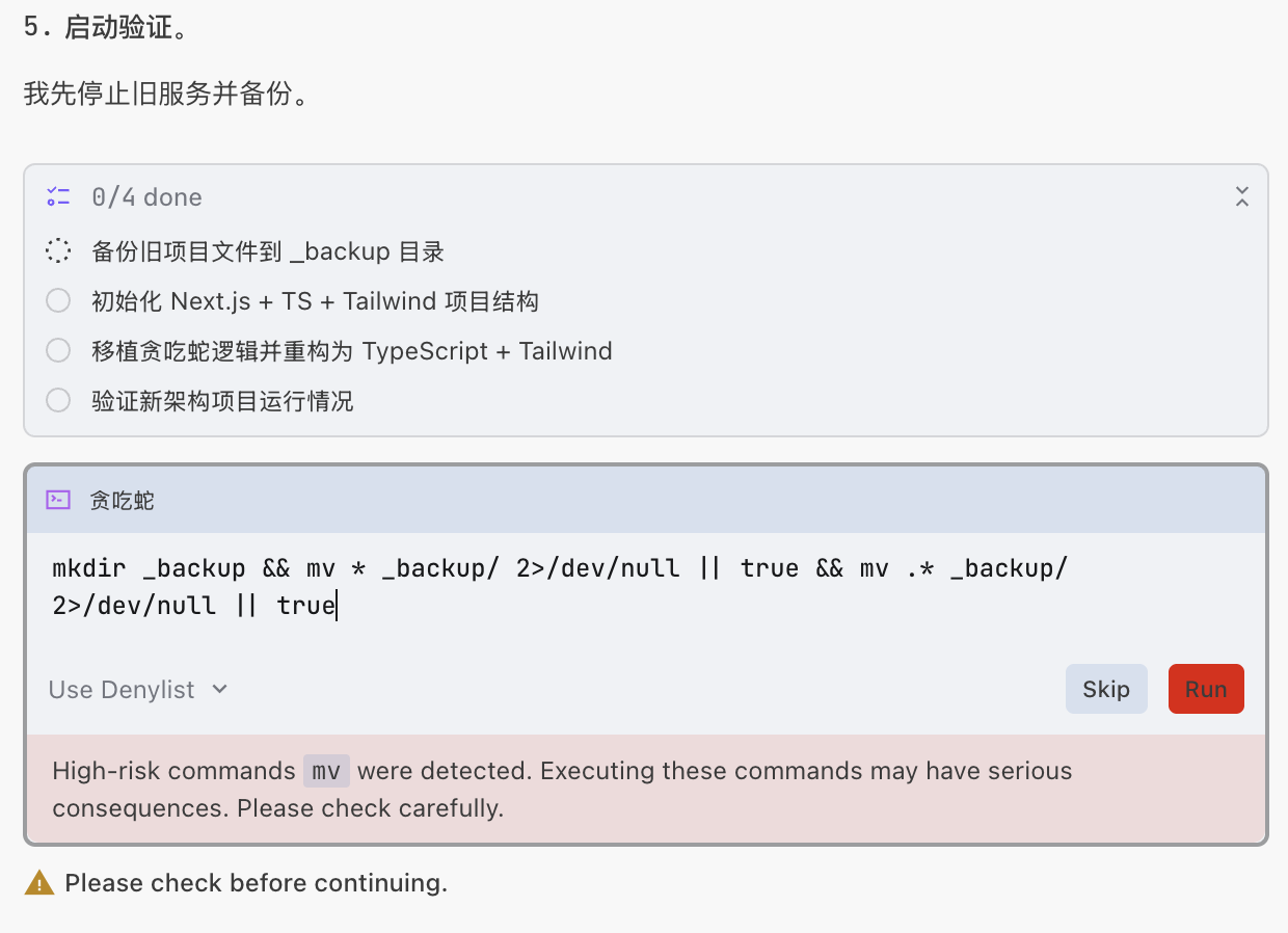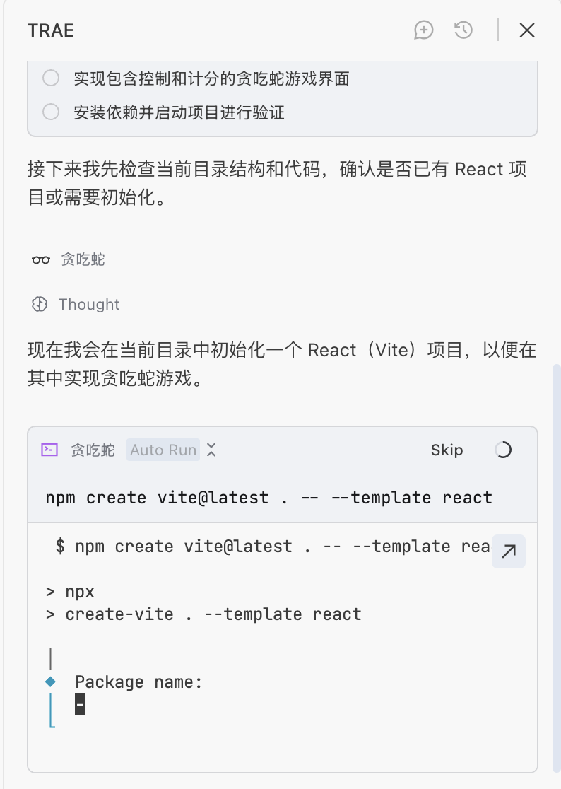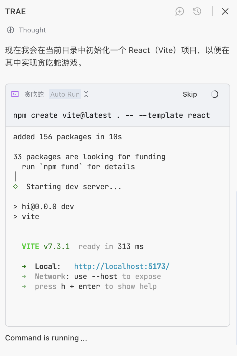 AI Agent 在执行过程中暂停的还有一部分原因是因为此时启动了一个“服务”,我们的贪吃蛇本身属于一种“服务”,如果你看到如下命令的网址,则表示 Agent 帮我们执行了一个本地的电脑服务,我们可以访问对应的网址访问我们的贪吃蛇,由于服务需要持续启动,这里会陷入暂停。我们只需要点击 Skip 按钮即可。