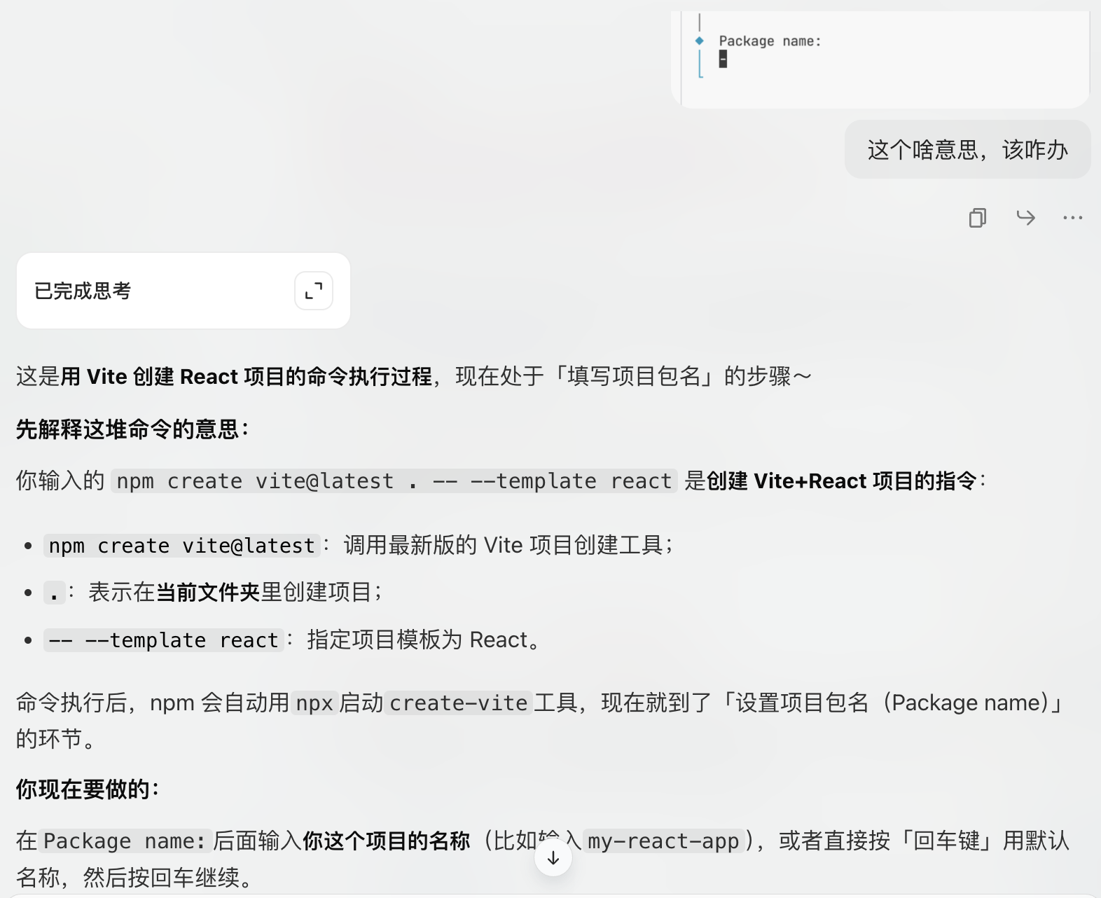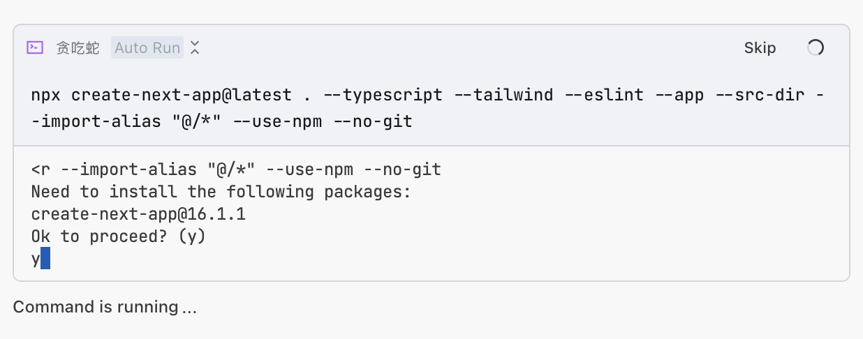 例如下图所示,有时候 AI Agent 会在执行的过程中暂停,这是因为它需要等待你输入一些信息进行交互,比如输入创建的名字,或者回车确认指令执行。或者点击指令进行执行。一般情况我们直接回车即可,如果你不确定这步需要做什么,你可以截图当前界面询问大模型应该如何操作。