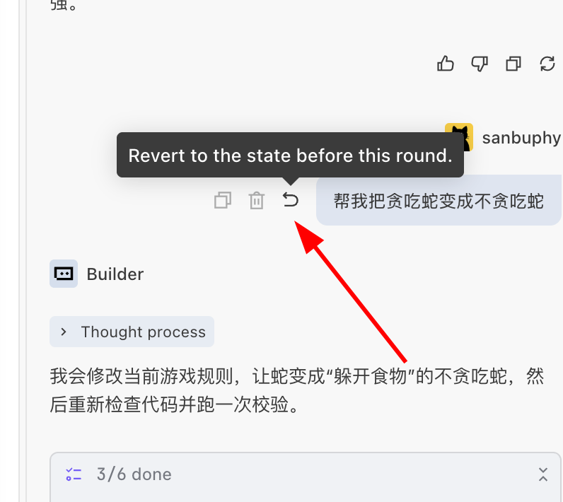 这里还值得注意的是,由于修改代码并不一定正确,我们还需要知道所有的 IDE 的 Agent 都支持代码回退,例如,假设我这里不小心做了个错误的修改操作,或者这次操作的结果让你感到不满意,在修改结束后我们可以返回输入框的部分,点击 Revert 按钮将操作回退到修改前的状态,你可以修改输入的文字进行再一次操作: