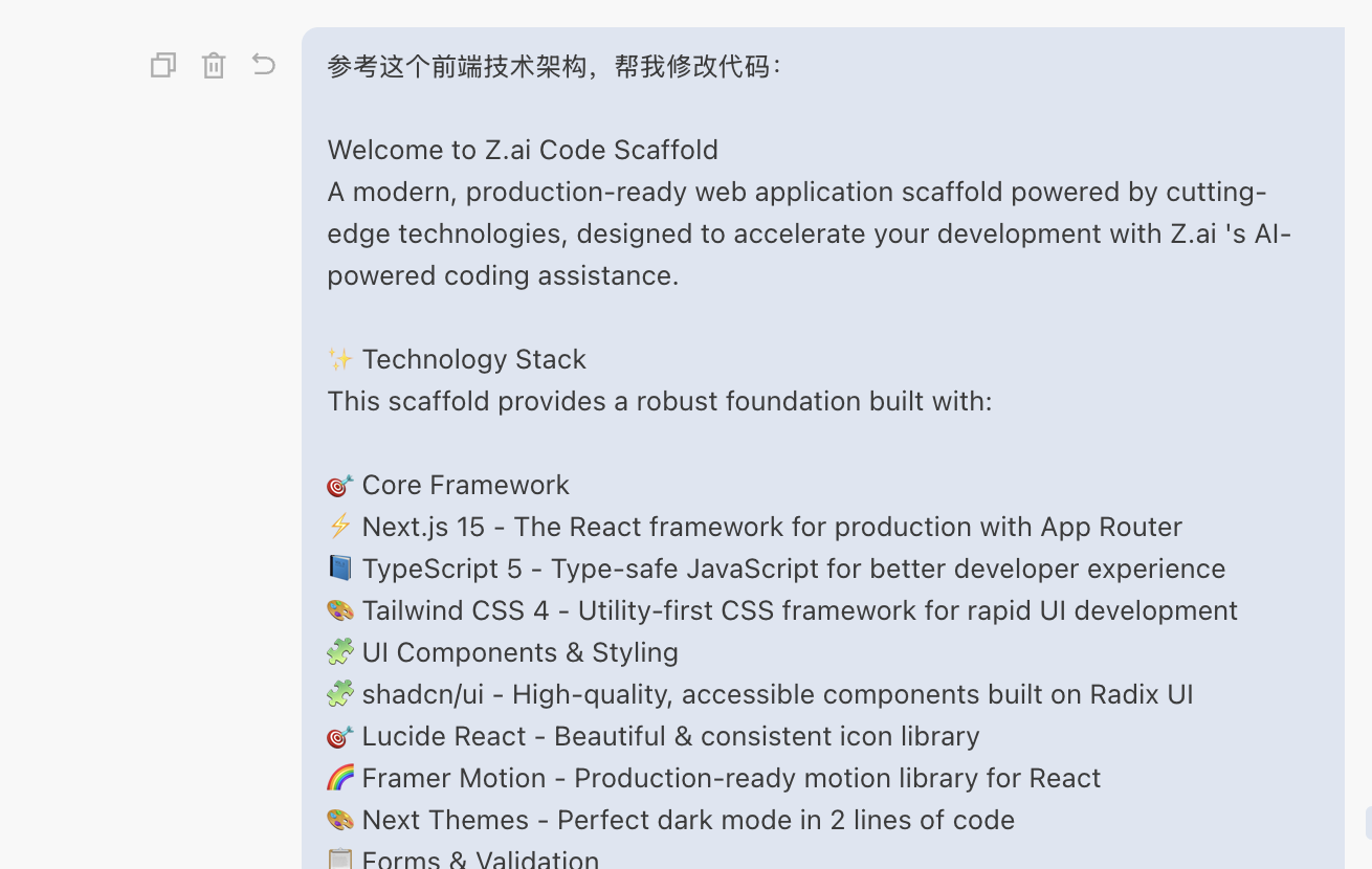 以上就是对 Trae 的一个简单介绍。接下来,我们可以回顾一下之前在 z.ai 中做过的操作,并尝试在 Trae 中做同样的事情。