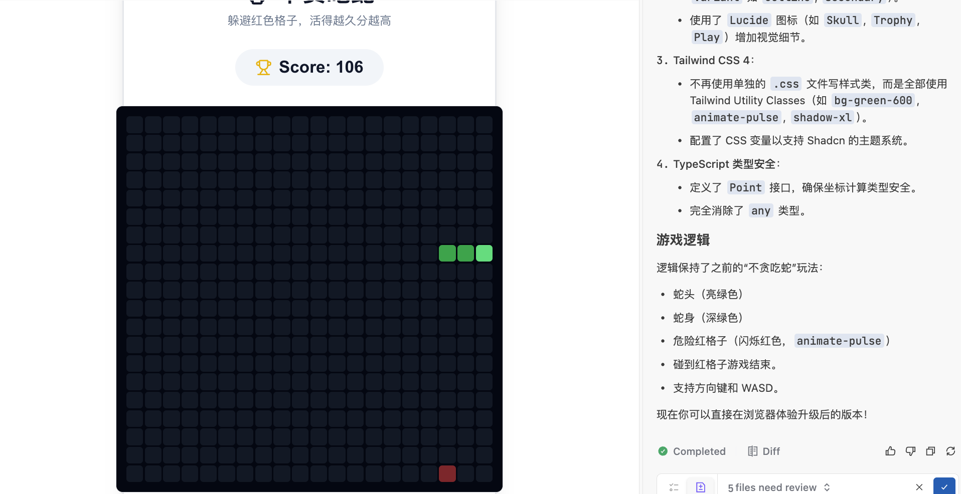 如果你在过程中遇到不符预期的现象,例如贪吃蛇撞墙后不会结束游戏,贪吃蛇点击开始后不会移动,这时你只需要把现象描述给侧边栏 Agent 即可。如果遇到报错问题,记得截图或者复制错误到侧边栏 Agent,如果多次仍然不能解决问题,请你尝试更换模型操作。