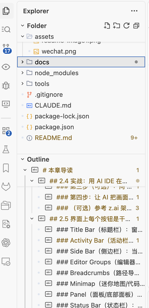 补充说明:再次点击同一图标通常可切换该视图的展开/收起;将鼠标悬停在图标上通常可看到视图名称与快捷键提示。AI IDE 往往会在此处增加 AI 相关入口(如 Chat/Agents/Project Context),用于打开对话面板或启用项目级分析能力。