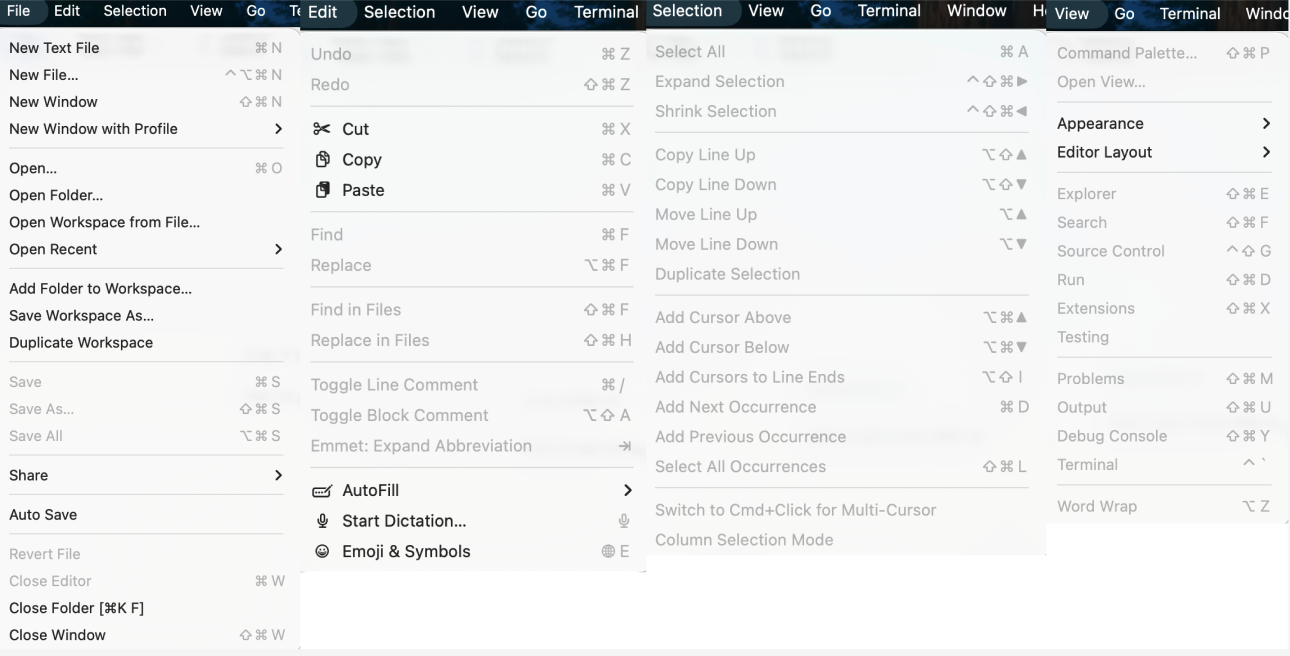 本菜单主要负责:打开/管理集成终端,以及运行与配置 VS Code 任务系统(Tasks)(如 build、运行脚本等)。