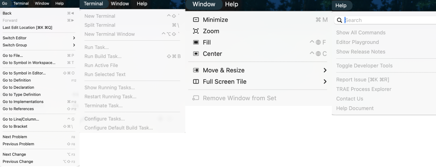 这一栏基本是操作系统级别的窗口控制,日常开发你最多会点一下 Minimize(最小化) 和 Full Screen / Fill(全屏/填充)。其他像分屏贴靠、居中布局之类,更多是界面体验上的微调,等你熟悉了再根据自己习惯慢慢试。