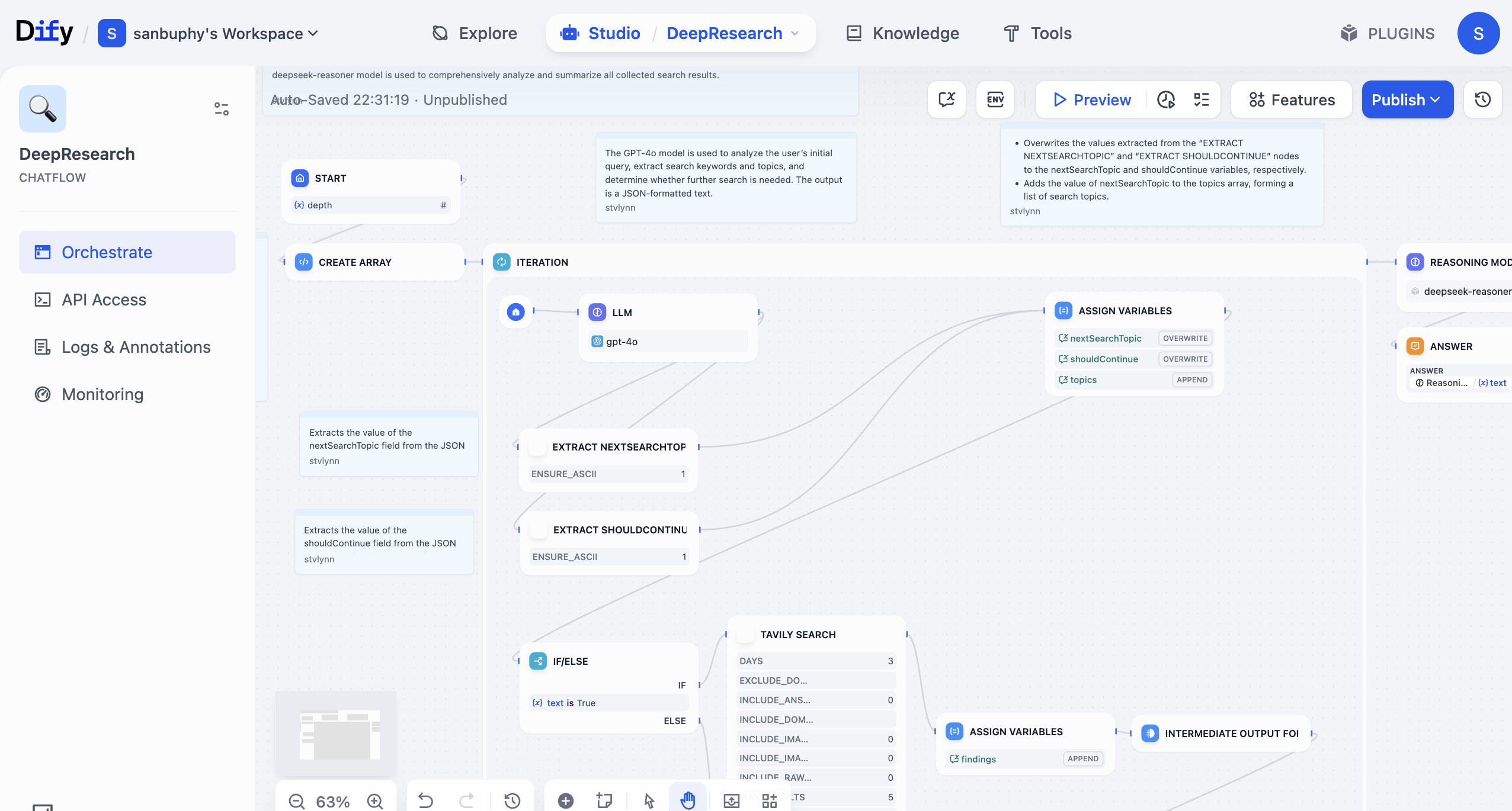 你可以在 Dify 中使用大语言模型和各种功能不同的工具来搭建“工作流”。所谓工作流,就是把原本需要你手动一步步完成的操作——例如数据检索、大模型调用、网页搜索、结果过滤、格式整理等——按照业务逻辑串联起来,变成一个自动化、可复用的流程。如果没有工作流,每次你都需要把同样的内容复制粘贴给大模型,非常低效、容易出错,也难以在真实业务中复用。
