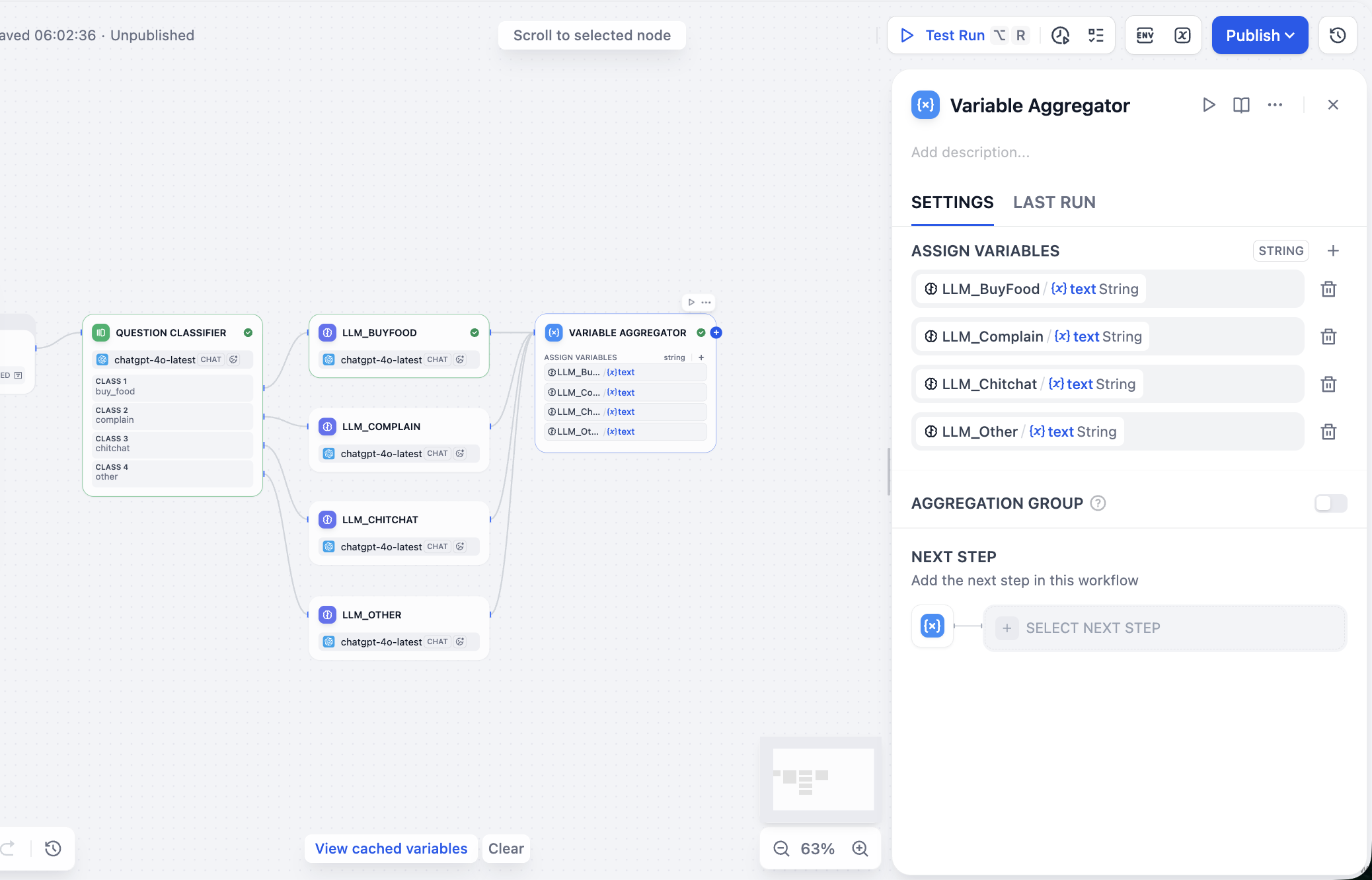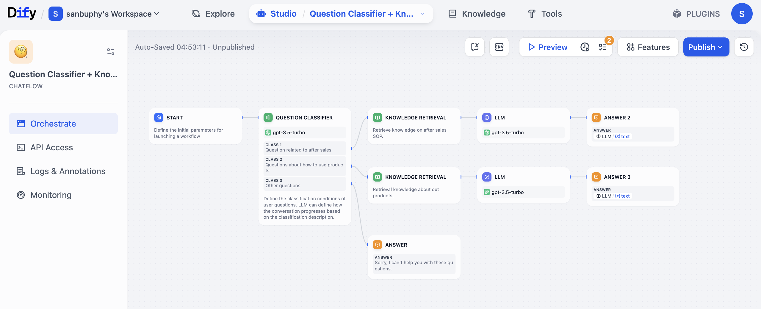 - 问题分类节点(类似 QUESTION CLASSIFIER):使用一个模型(例如 GPT)对用户问题进行分类,判断这是售后(比如质保)、使用方法,还是其他类型的问题。