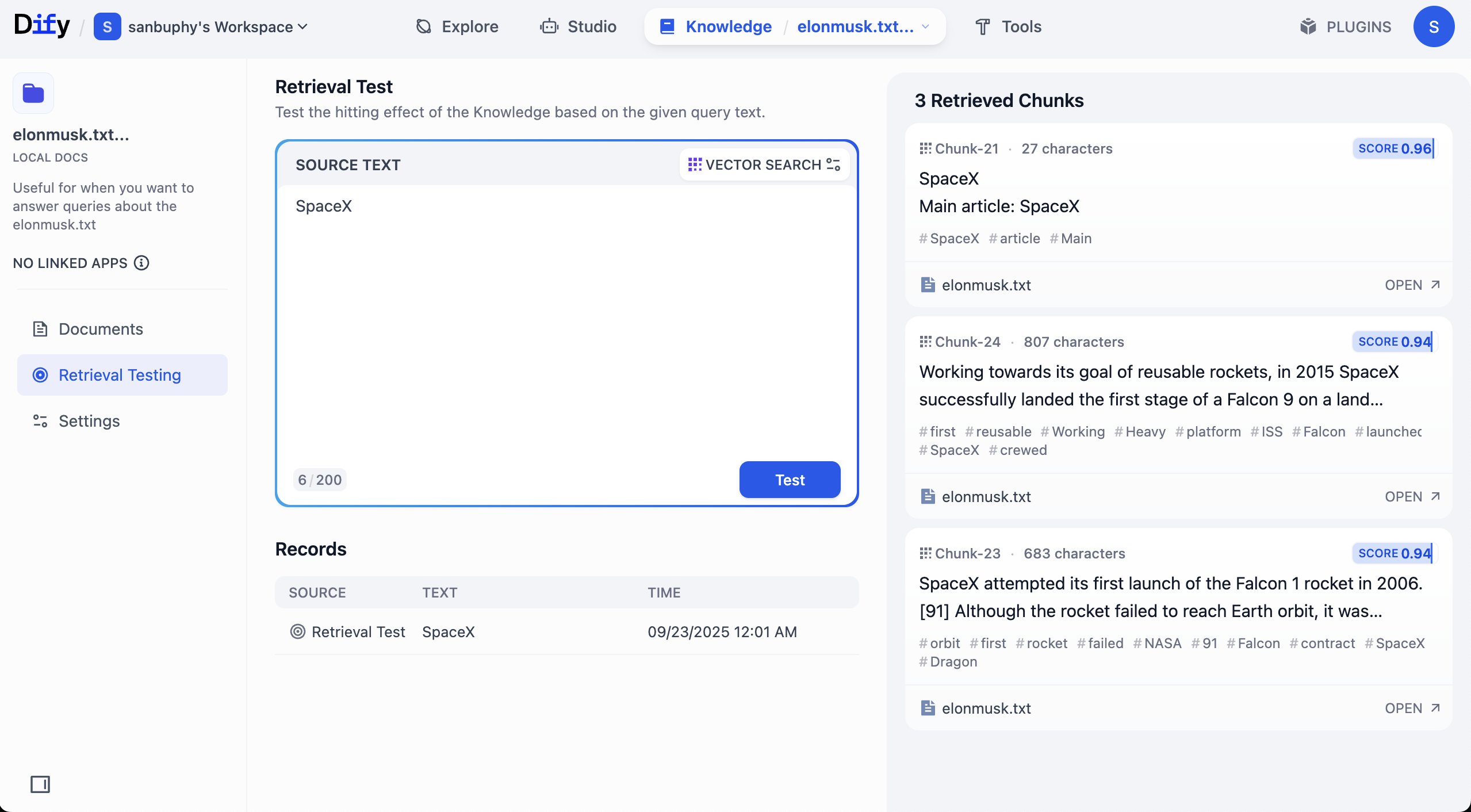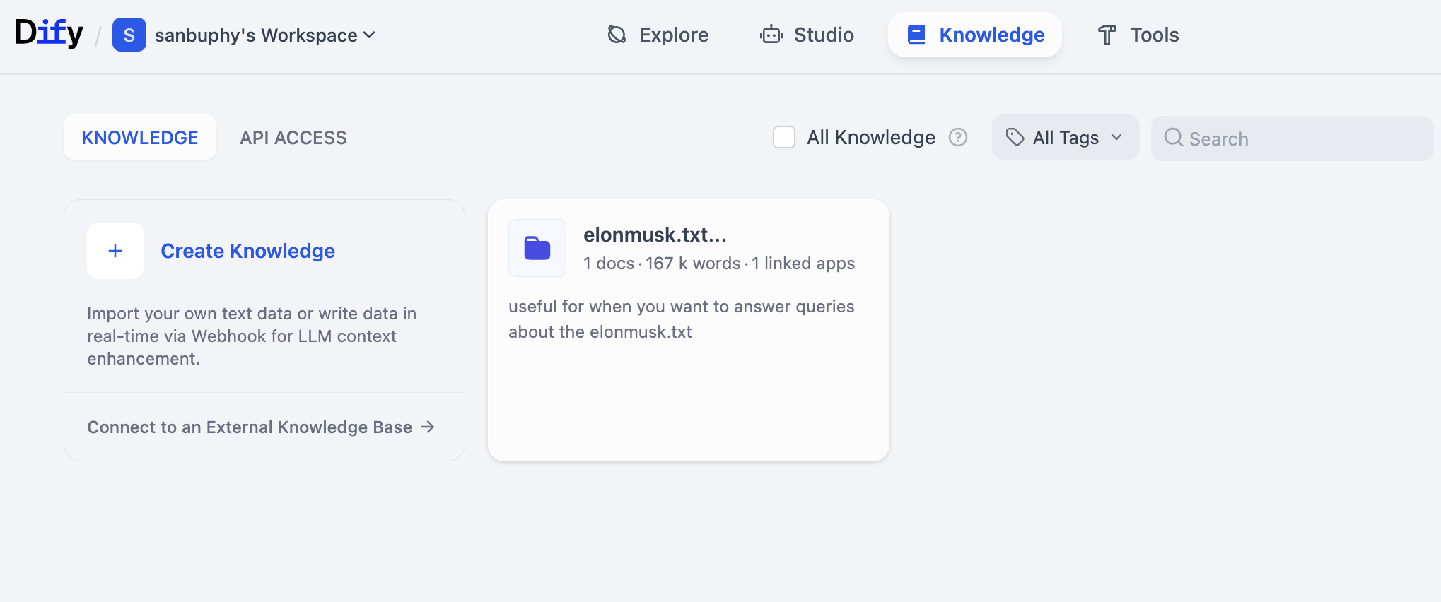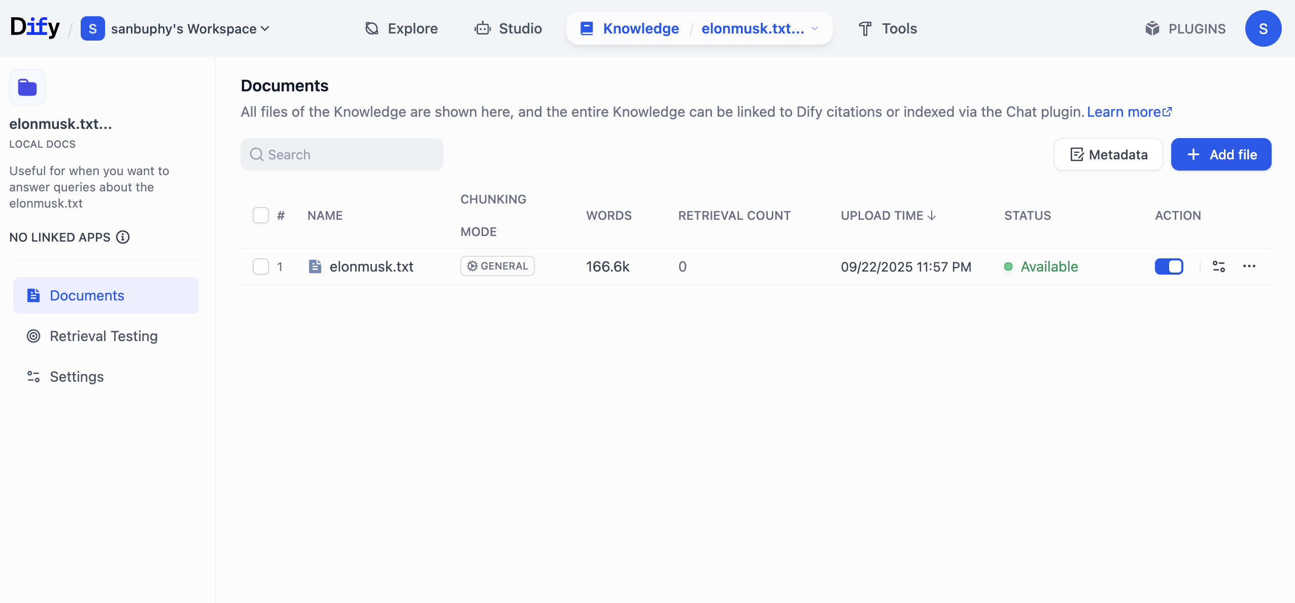 - 部署 Dify 并创建一个简单的知识库(选取你喜欢的资料)。