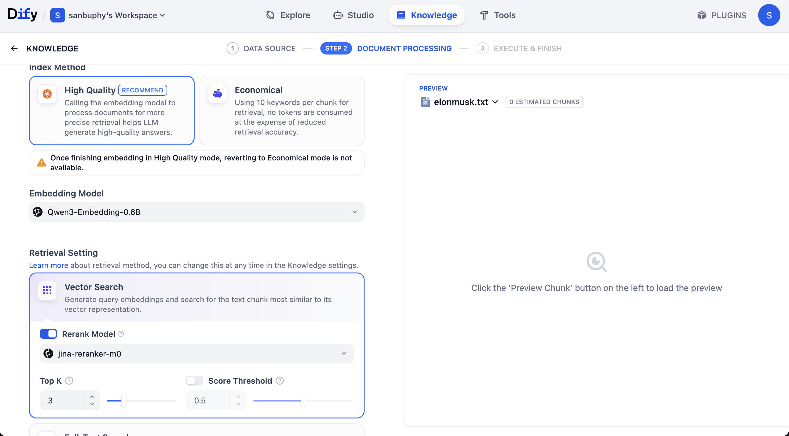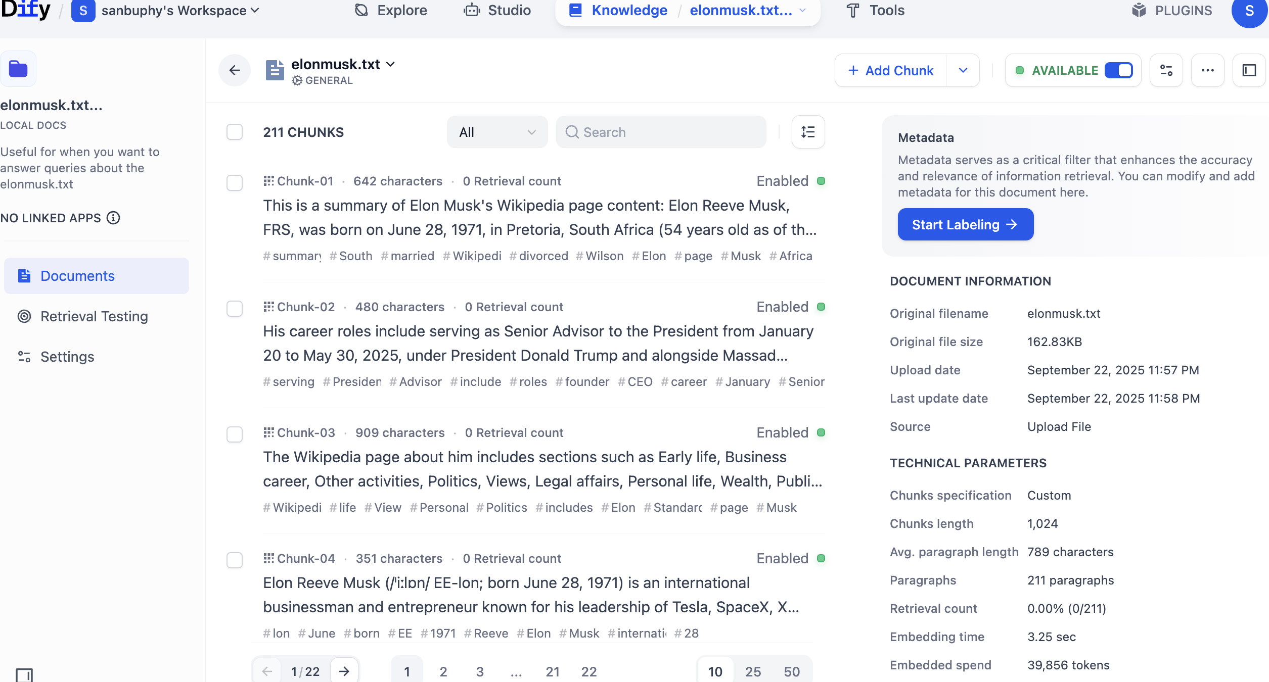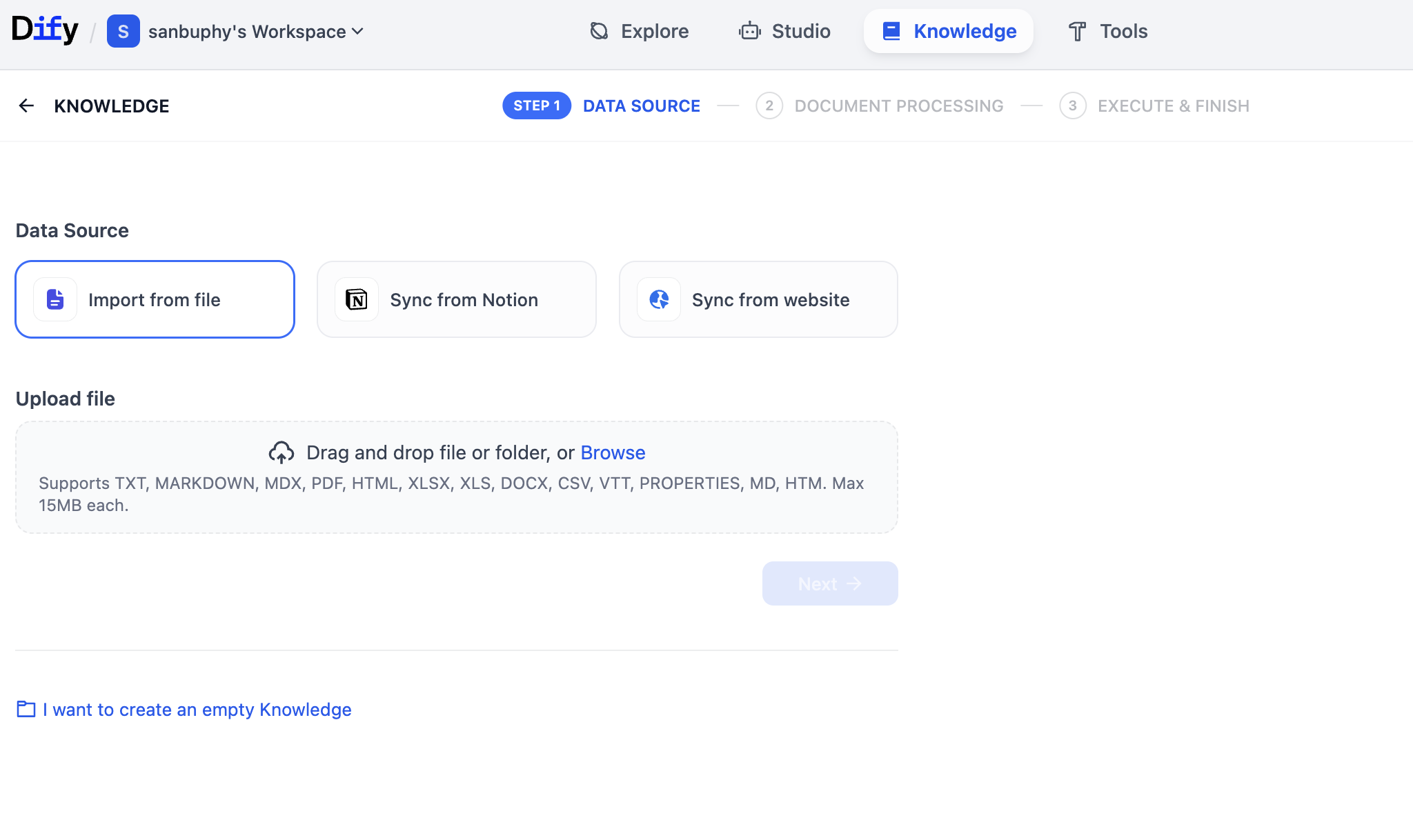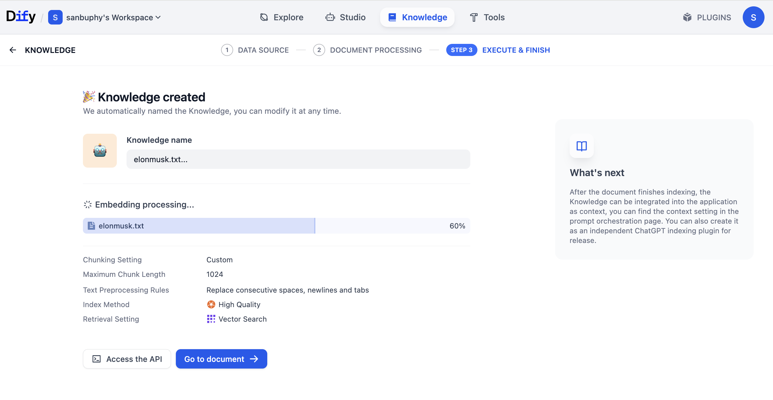 - 部署 Dify 并创建一个简单的知识库(选取你喜欢的资料)。