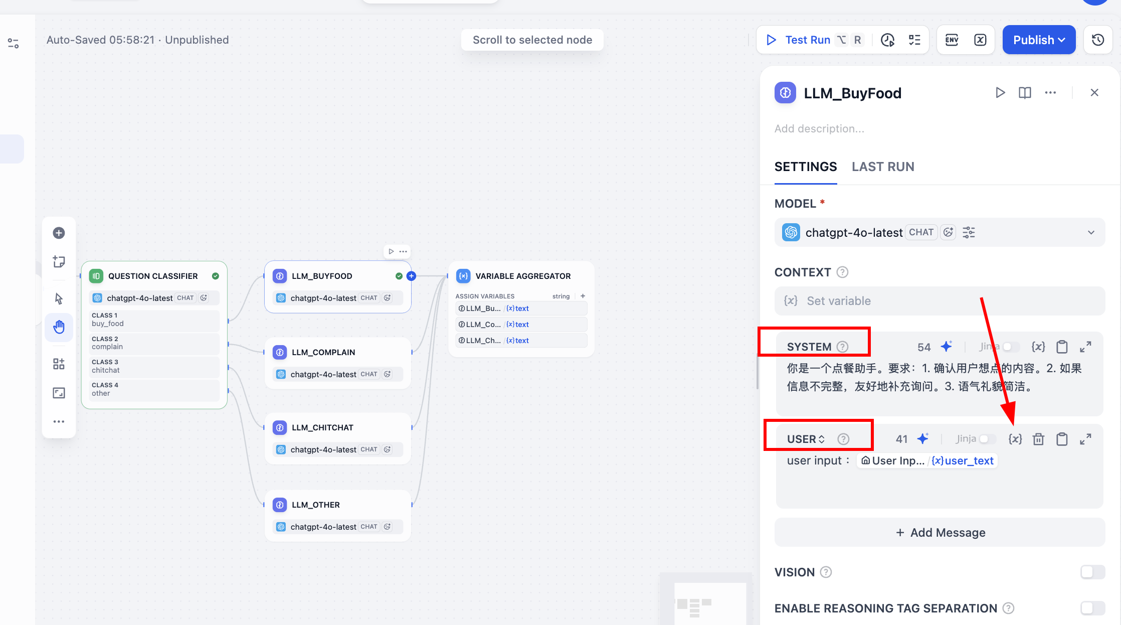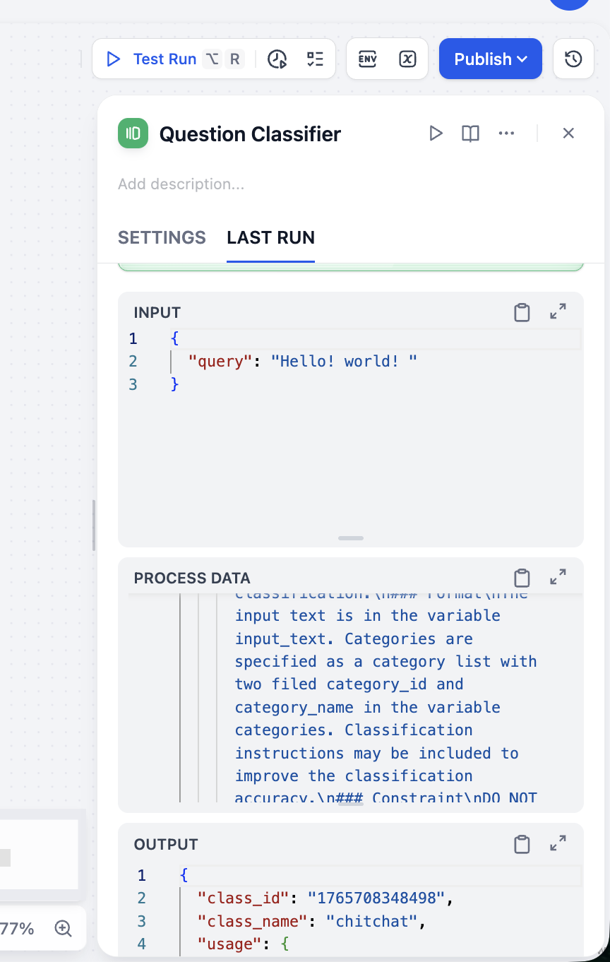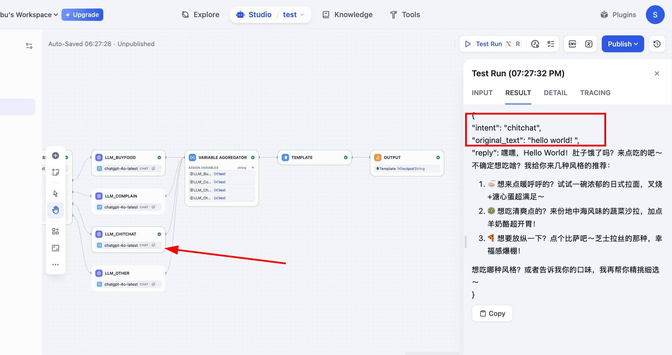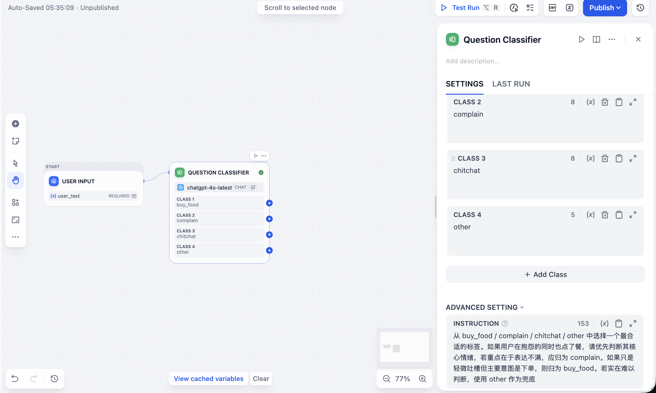 - 参考意图分类工作流的方法,让大模型给你建议完全换一套场景进行应用,但是一定要用到意图分类工作流,最后提交运行的工作流截图、场景说明、结果。