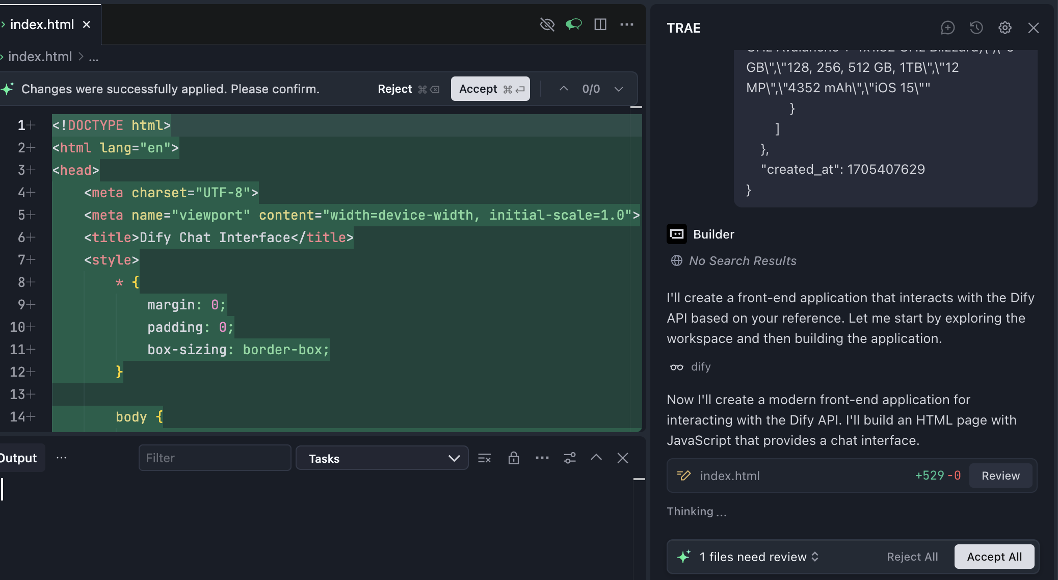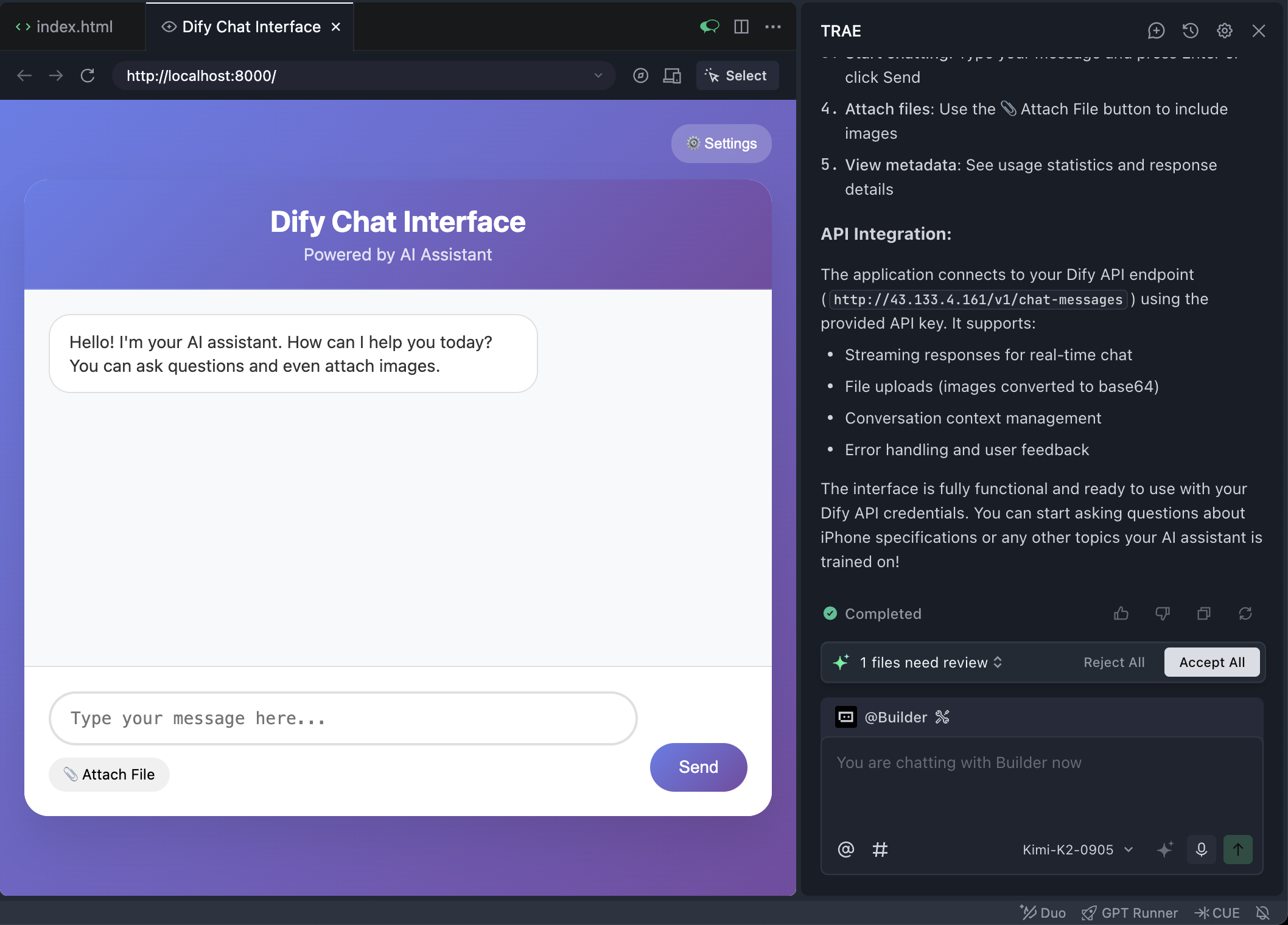 - 使用 Trae IDE 构建一个对话前端,与 Dify 知识库进行 API 交互。