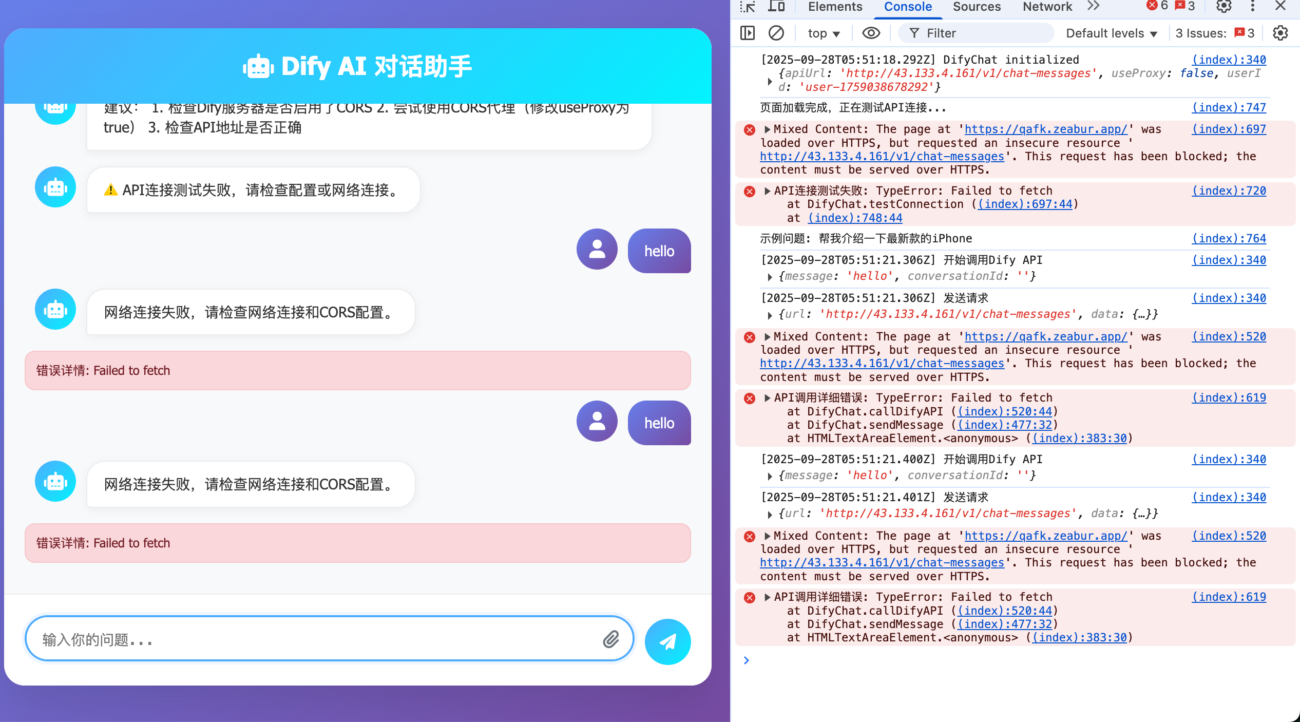 有时候可能你会把 Dify 部署在自己的服务器,但是服务器的对外地址通常都是 http 而不是 https 的,但当我们请求一个只支持 HTTP 的服务时,你可能会看到类似这样的提示(启用 F12 浏览器调试信息模式,查看有问题的点):