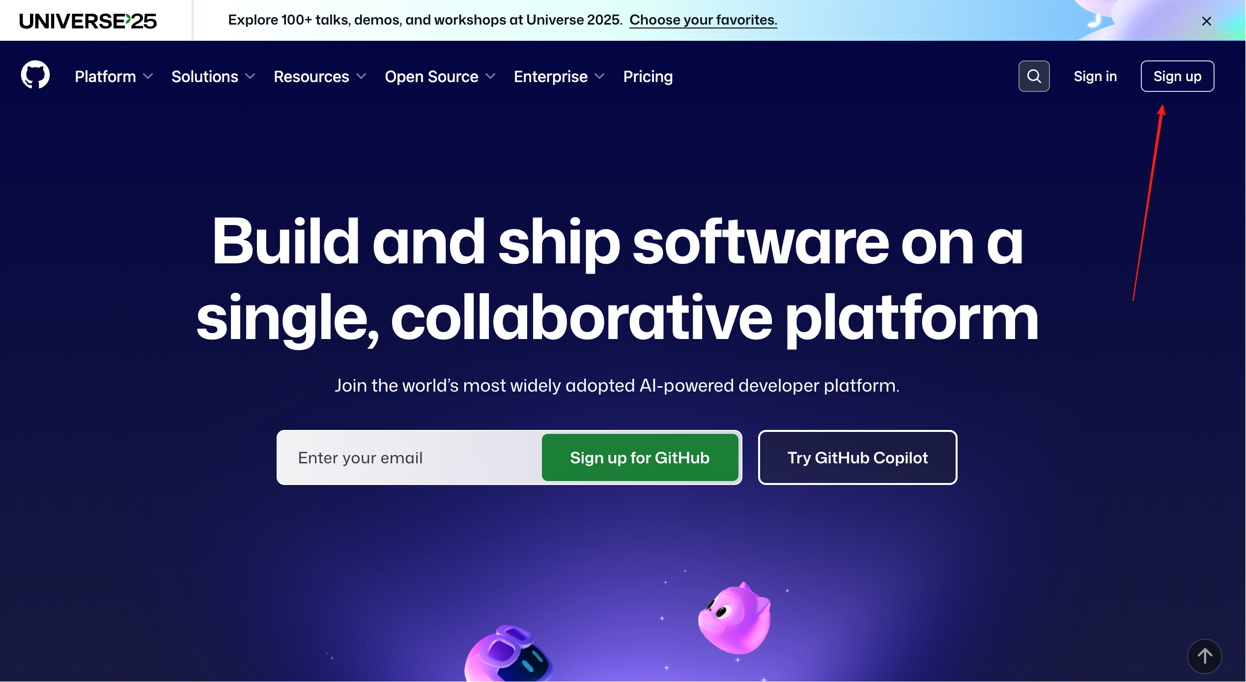 - 访问 GitHub 官网 并点击右上角的“Sign up”。