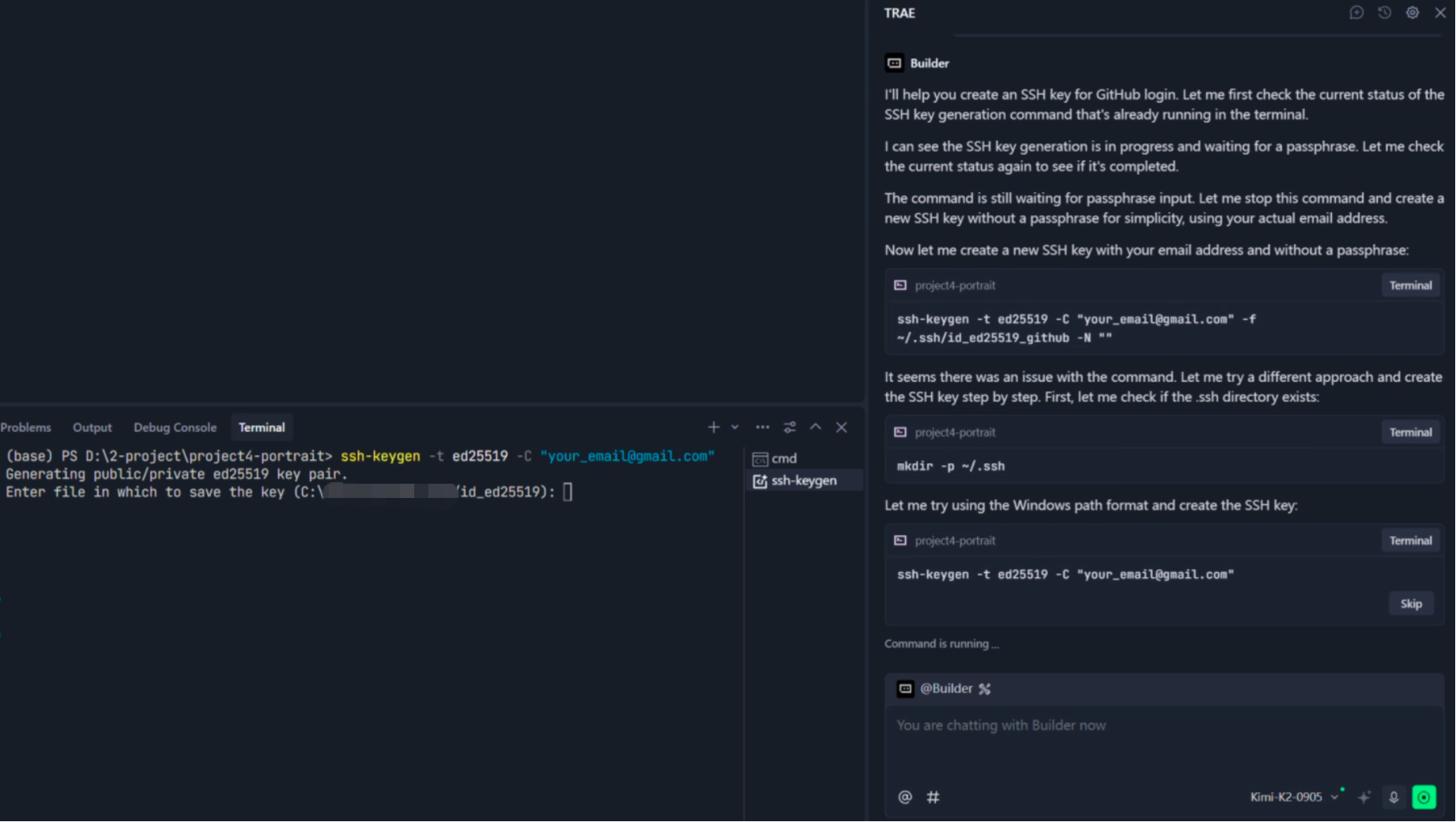 最后,你会看到右侧的 Trae 返回了它读取的公钥。你只需复制它并准备在下一步中粘贴。