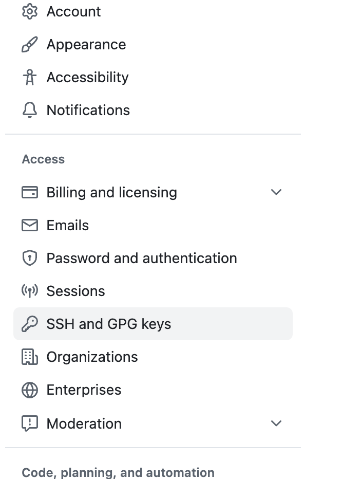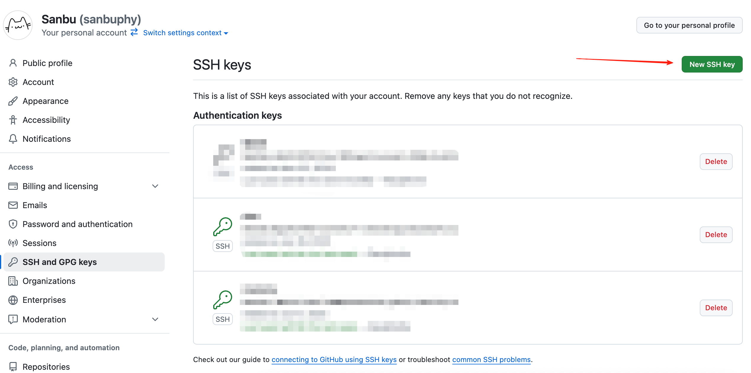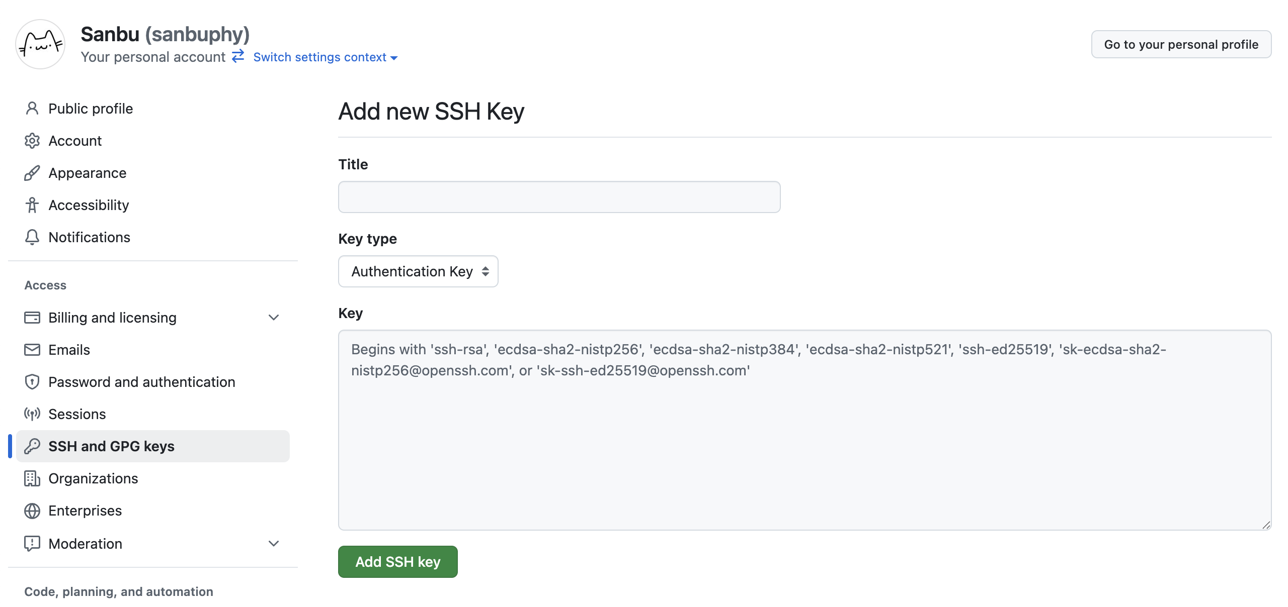 - 点击右上角头像 → Settings → 左侧菜单 SSH and GPG keys → 点击 New SSH key。