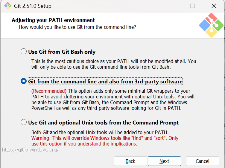 - 选择如何使用 Git:这三个选项控制 Git 在系统中的可访问性。建议选择选项 2(“from command line and 3rd-party software”)——它将基本的 Git 工具添加到 PATH 中,让你可以在 Git Bash、命令提示符、PowerShell 和 IDE 中使用 Git,而不会使系统混乱。