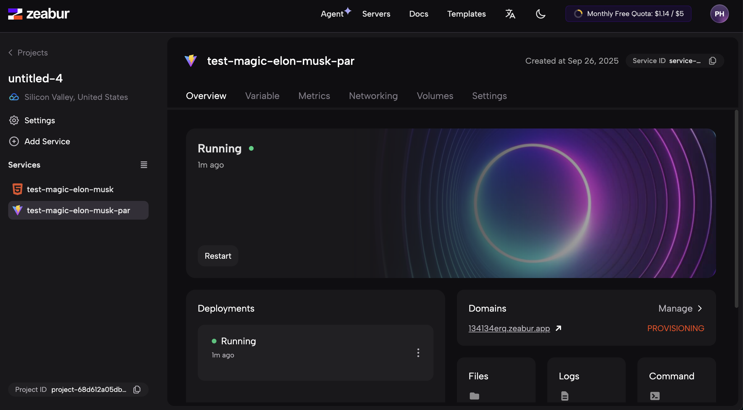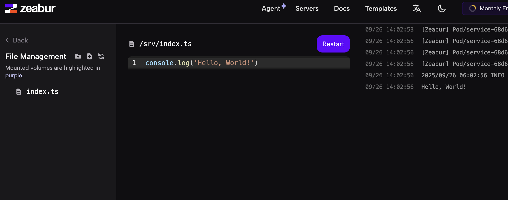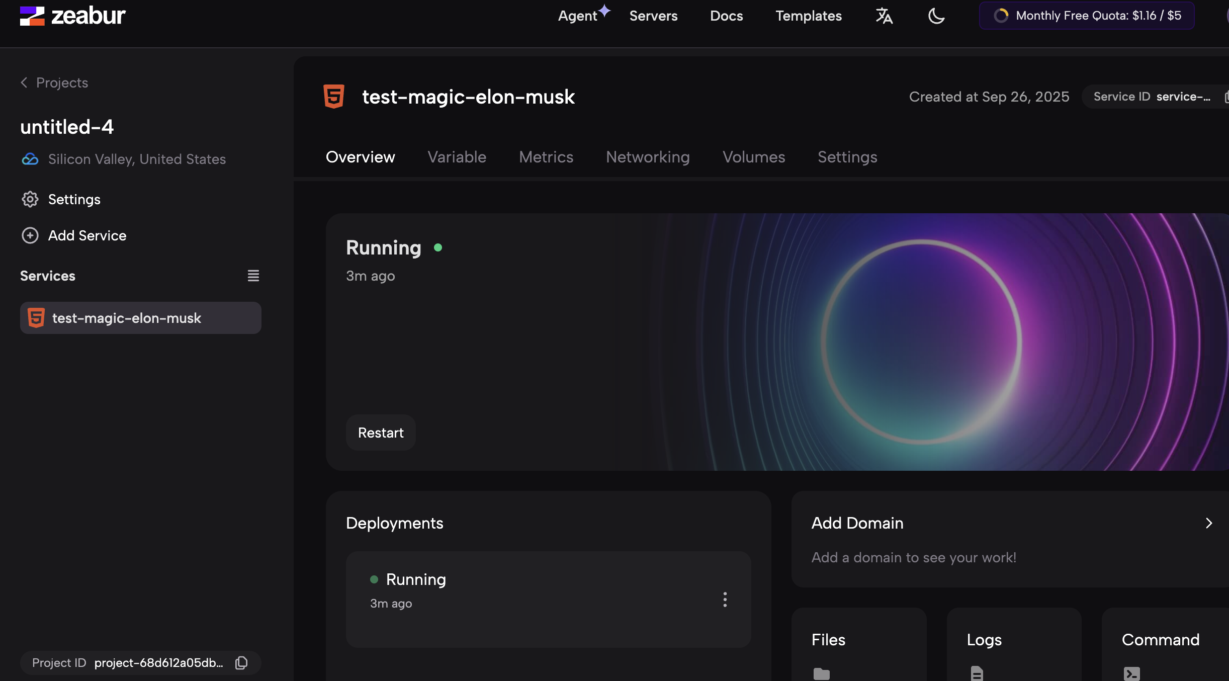 - Agent:可以打开 Zeabur 内置的智能助手(Agent),向它提问如何操作,或者查询当前服务器的状态。