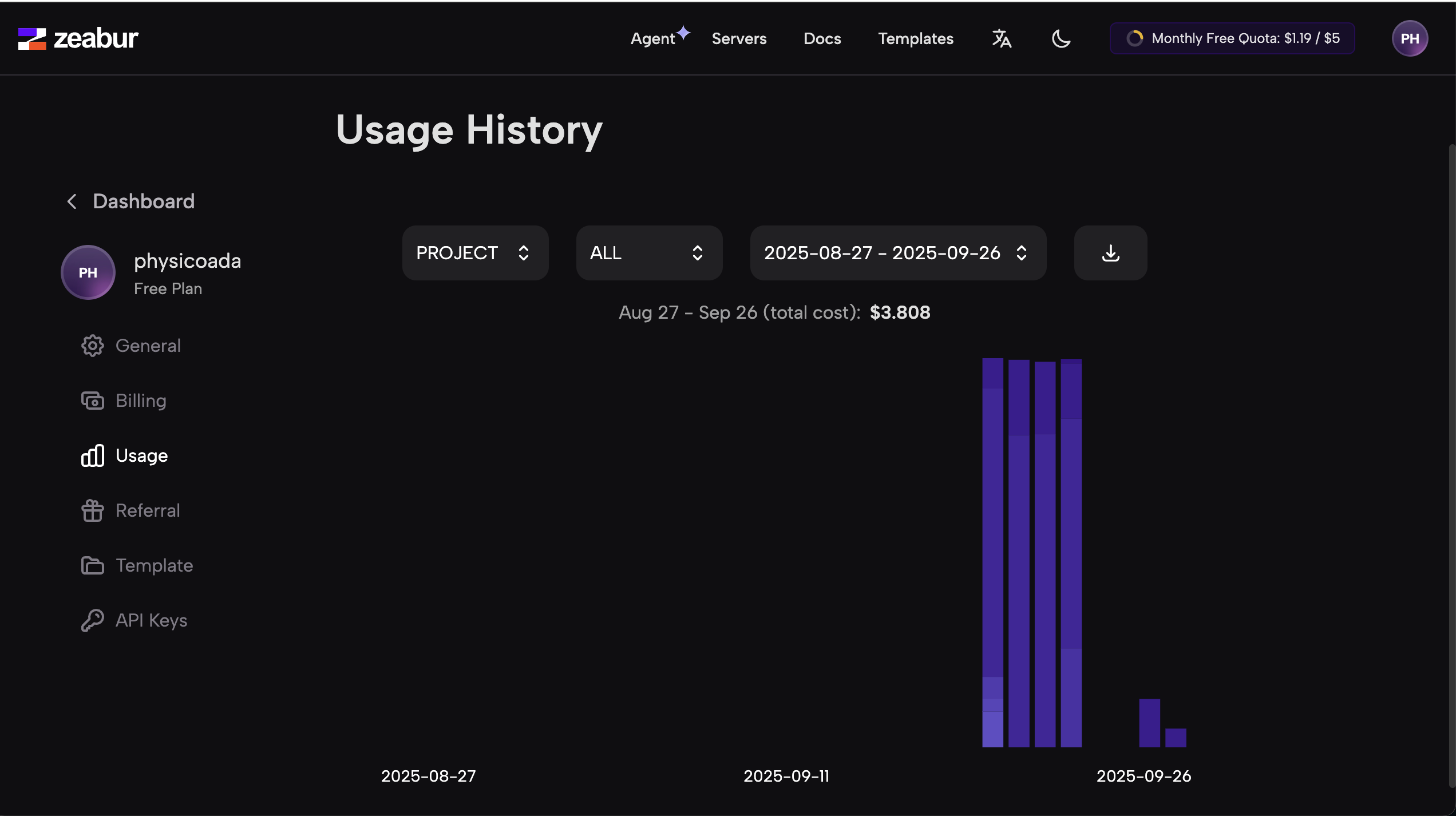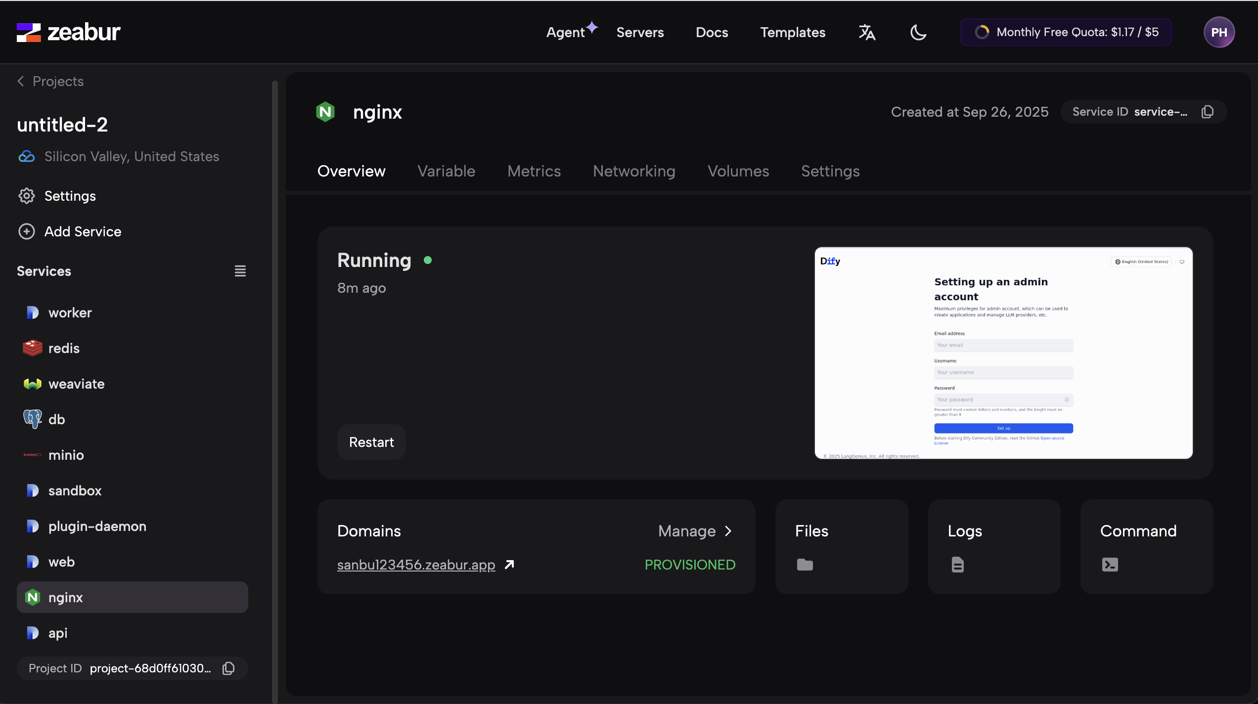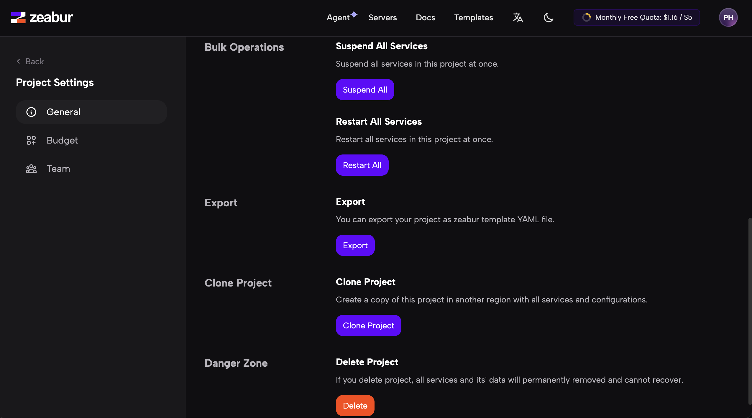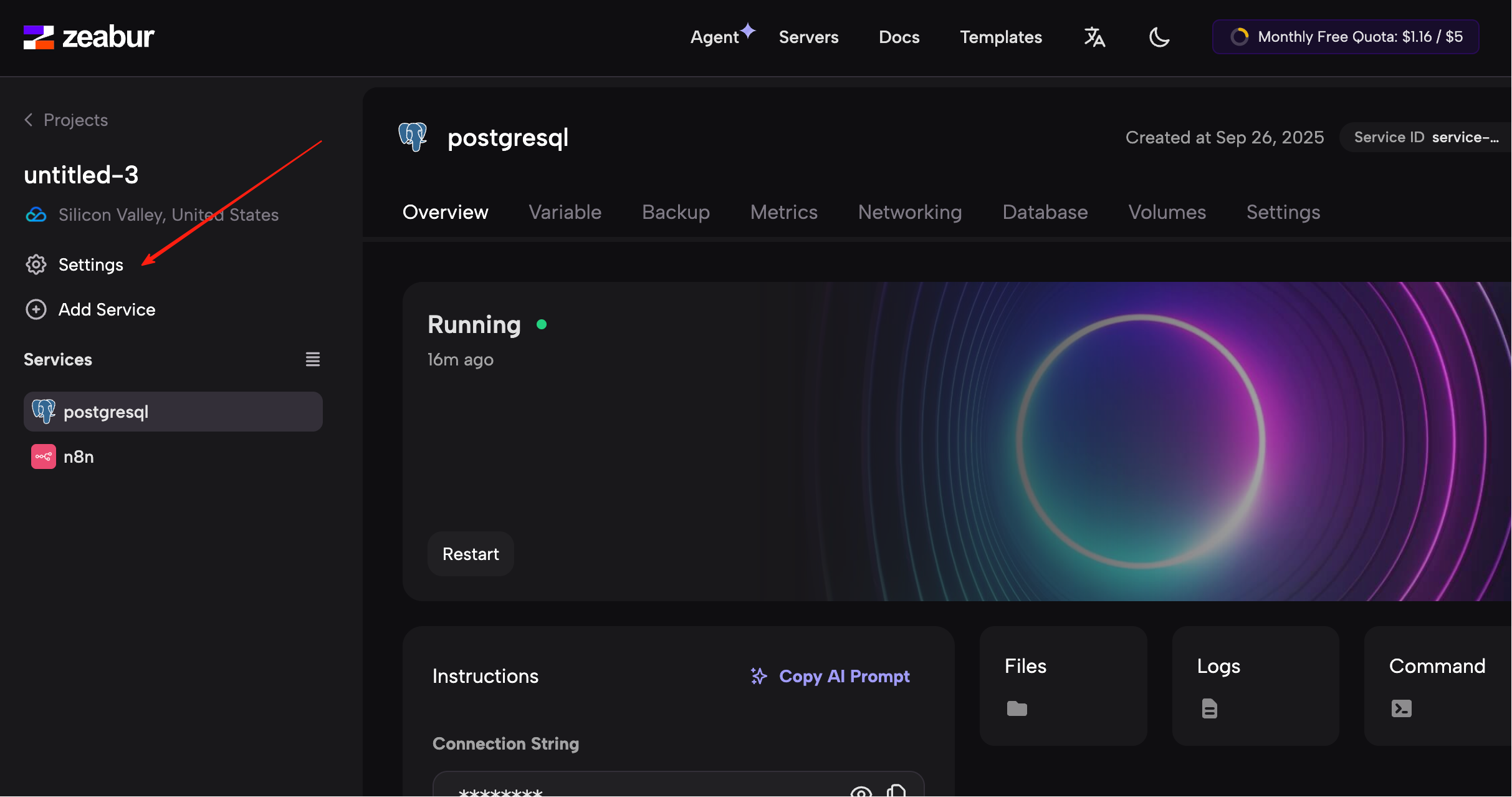 - Agent:可以打开 Zeabur 内置的智能助手(Agent),向它提问如何操作,或者查询当前服务器的状态。