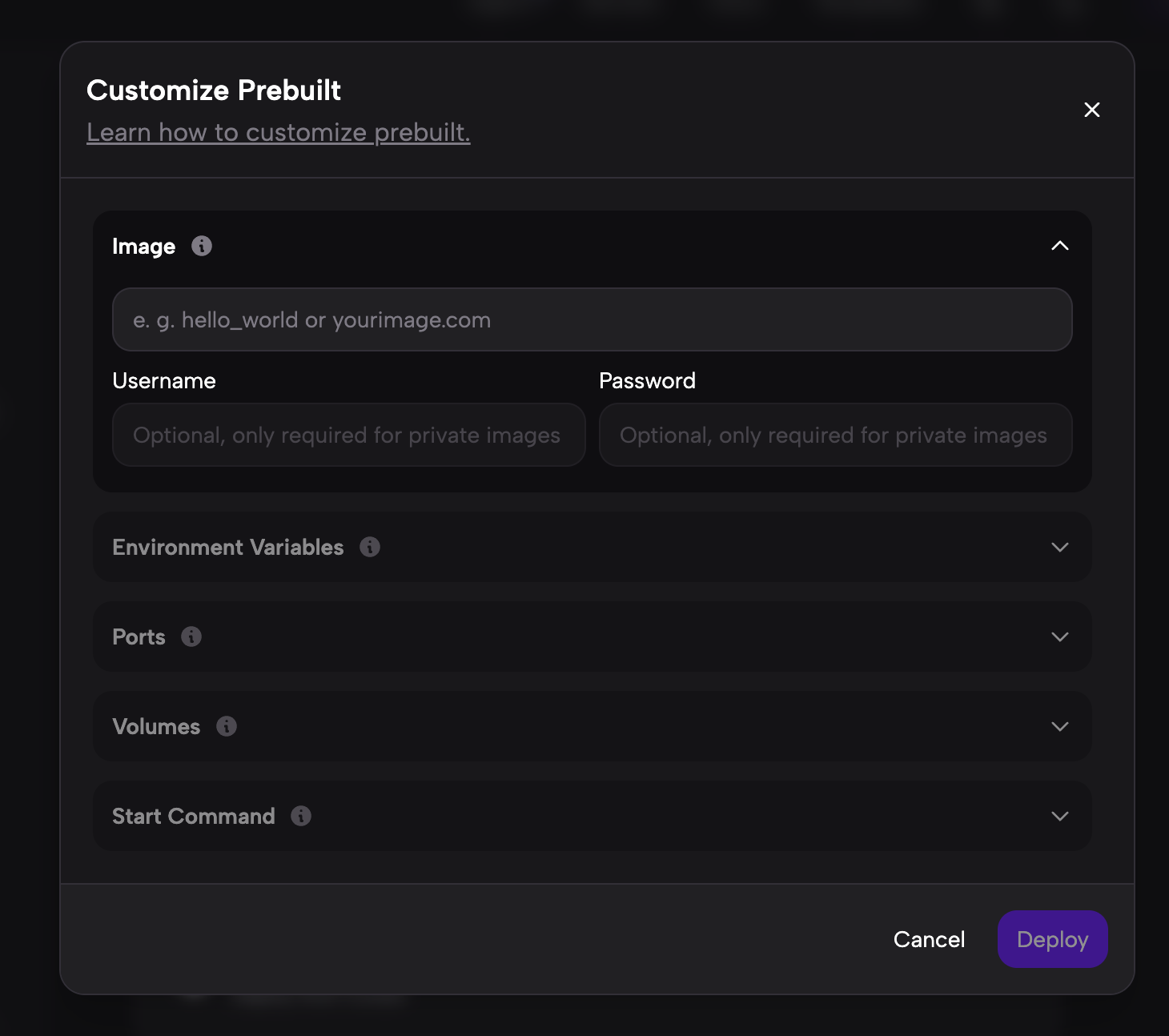 部署已经打包好的 Docker 镜像。如果你的项目已经被打成了 Docker 镜像(例如存放在 Docker Hub 或其他镜像仓库中),可以在这里直接部署。