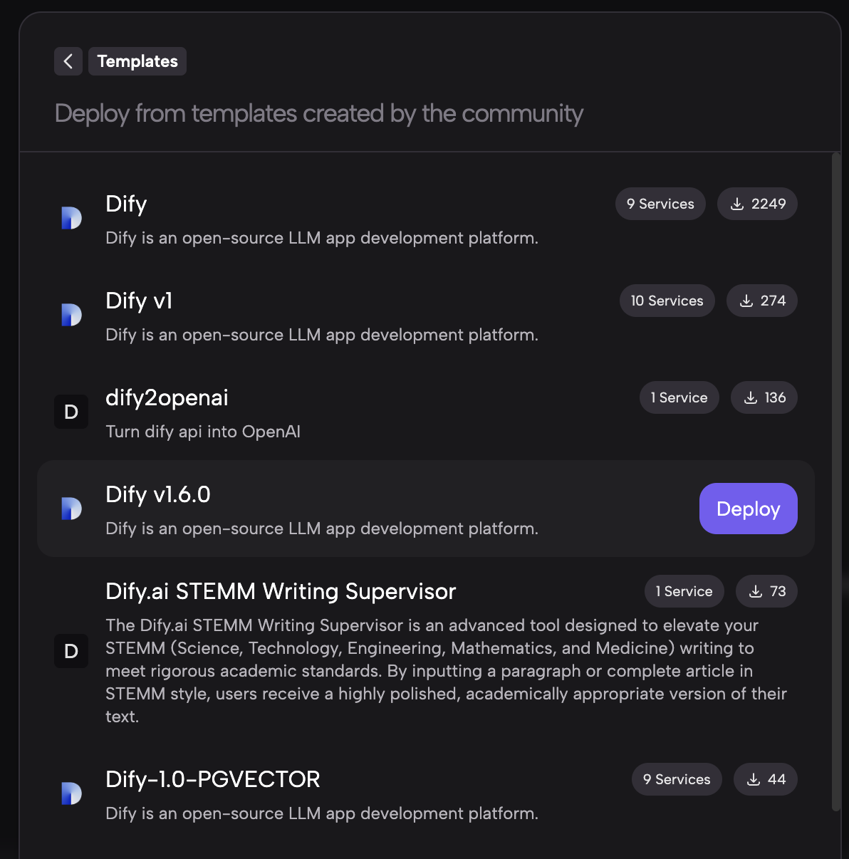如果你想部署自己的 Dify 服务,推荐选择 Template 方式,然后在搜索框中输入 “dify”。可以看到很多由不同作者维护的版本,你可以任选其一(比如 v1.6.0 版本)。