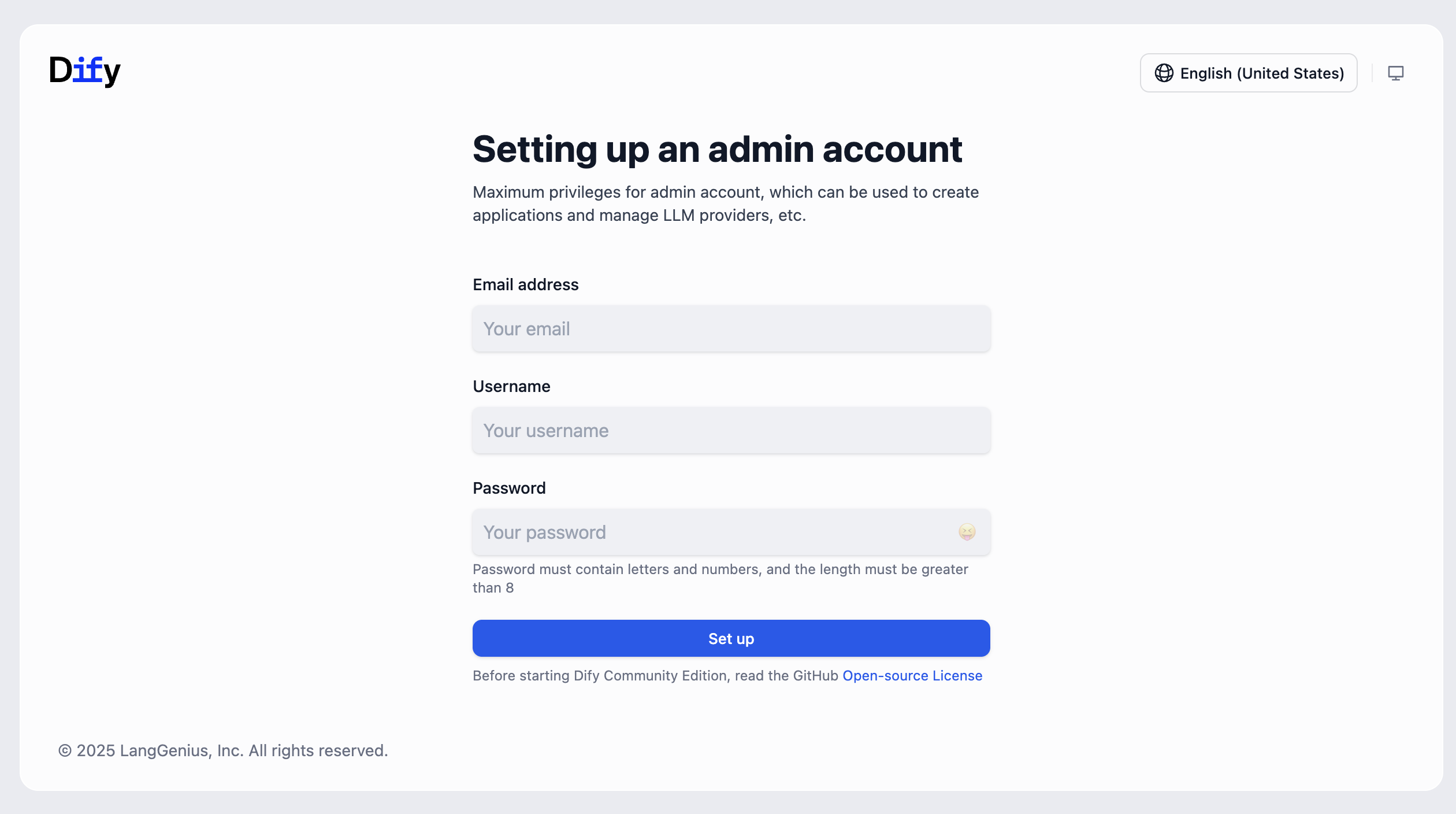 稍等片刻后,你就能看到 Dify 的登录界面了。输入邮箱地址和注册密码,就可以开始使用你自己的 Dify 服务了。