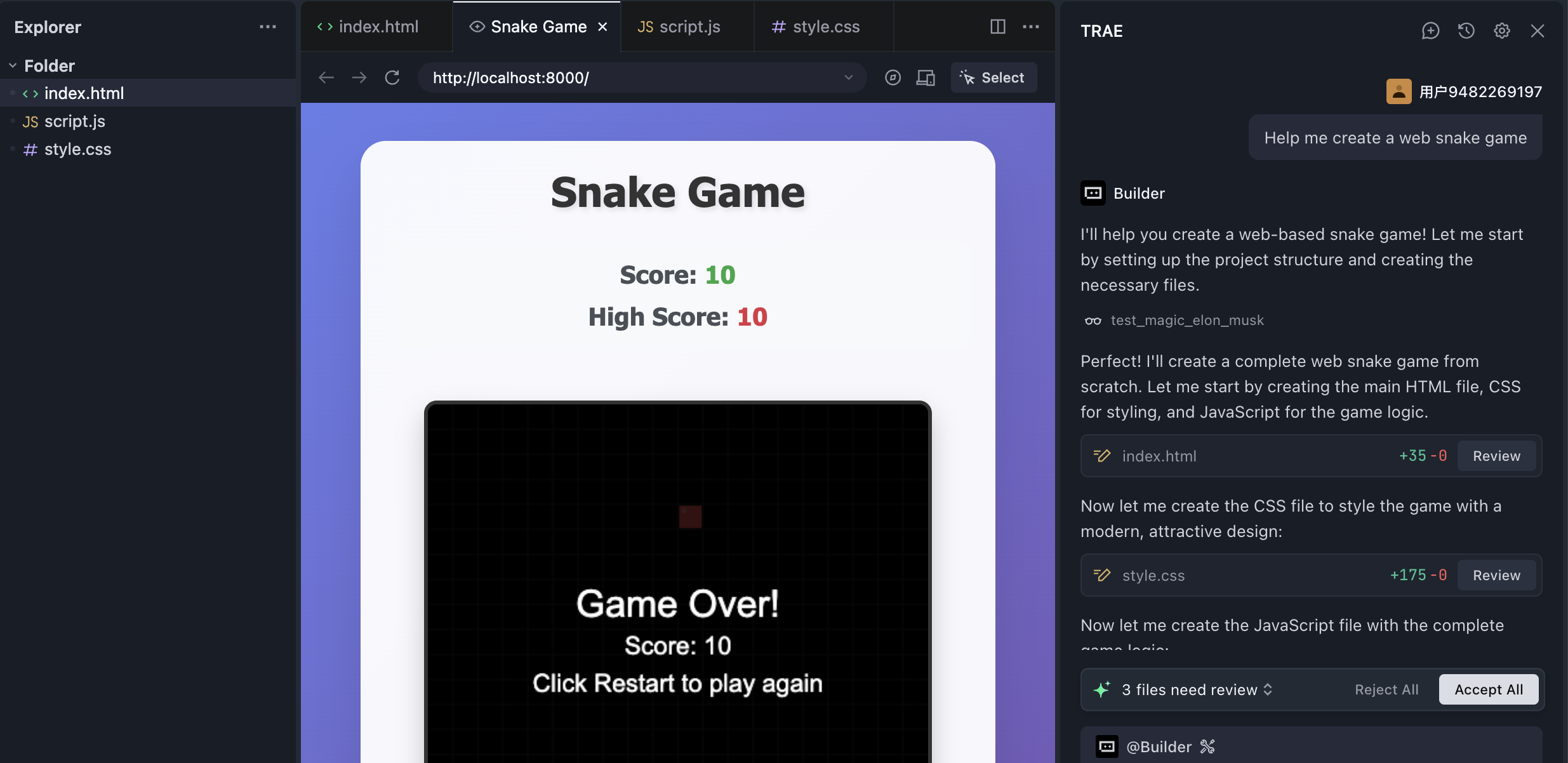 第一步,是在本地使用 Trae 创建一个贪吃蛇项目。