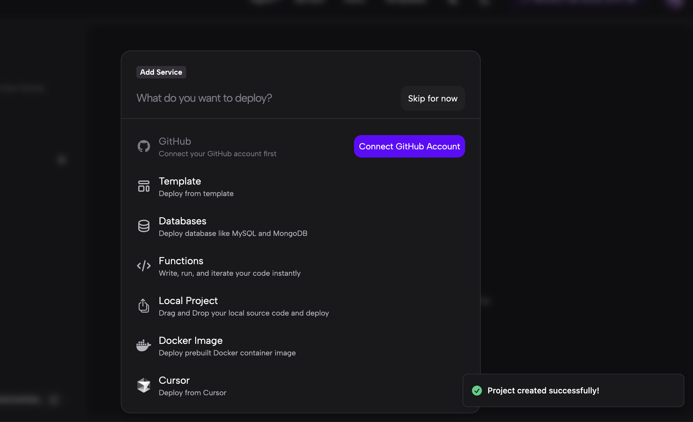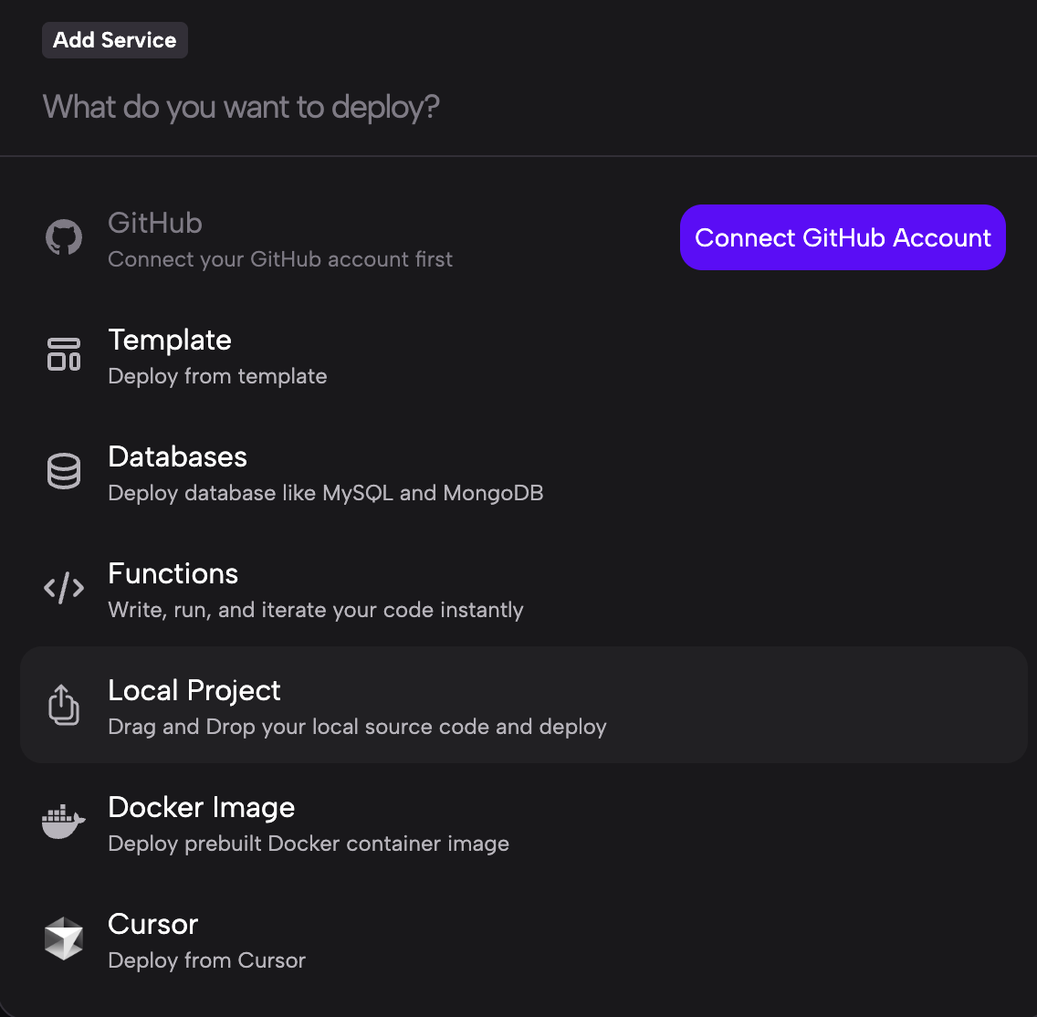 如果你安装了 Cursor(例如 Cursor IDE),可以通过这个入口将 Cursor 中的项目直接部署到 Zeabur。