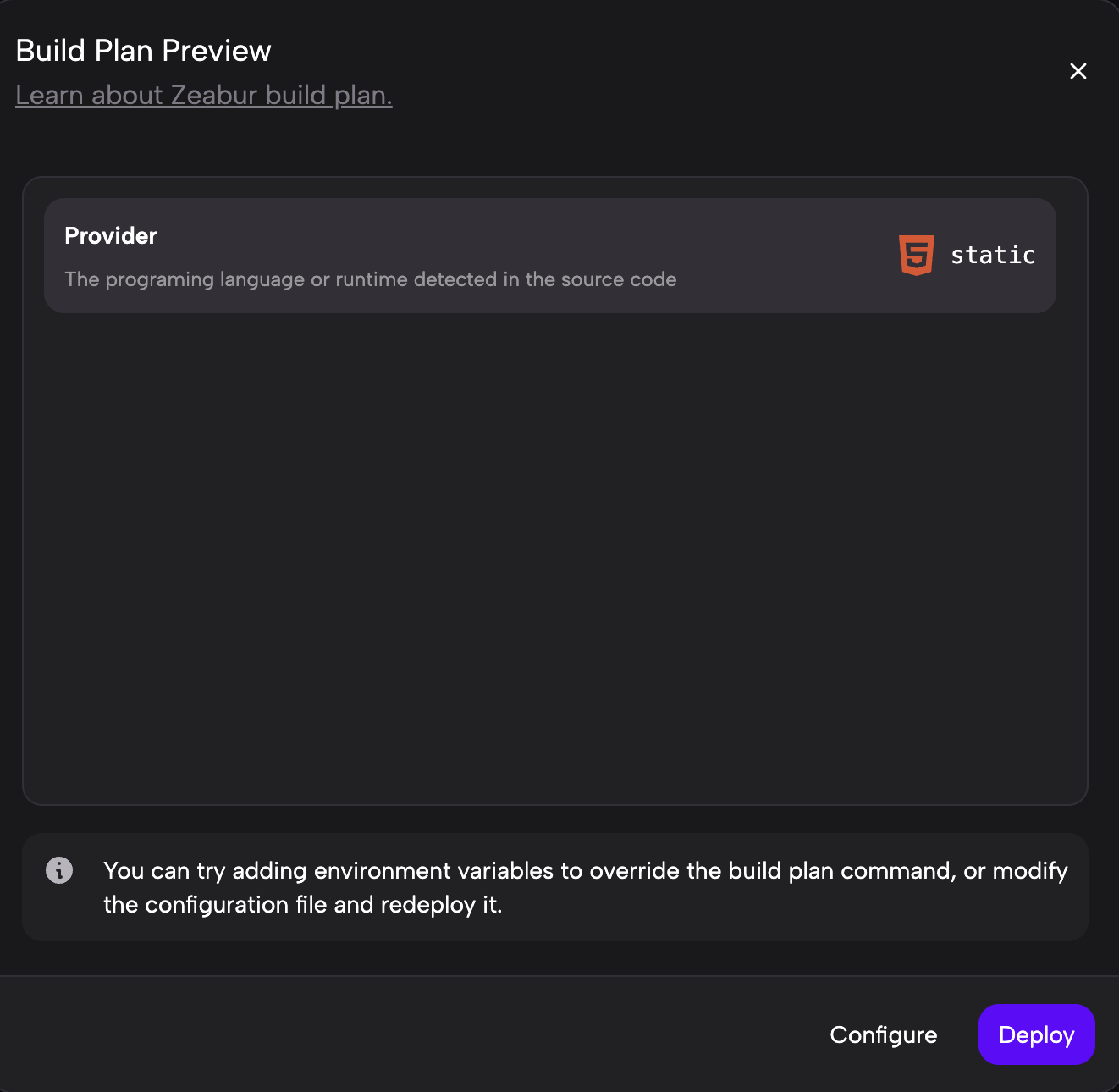 上传一个本地文件夹,Zeabur 会自动识别其中的启动脚本。这适合将你已经在本地开发好的项目快速部署到 Zeabur 上。