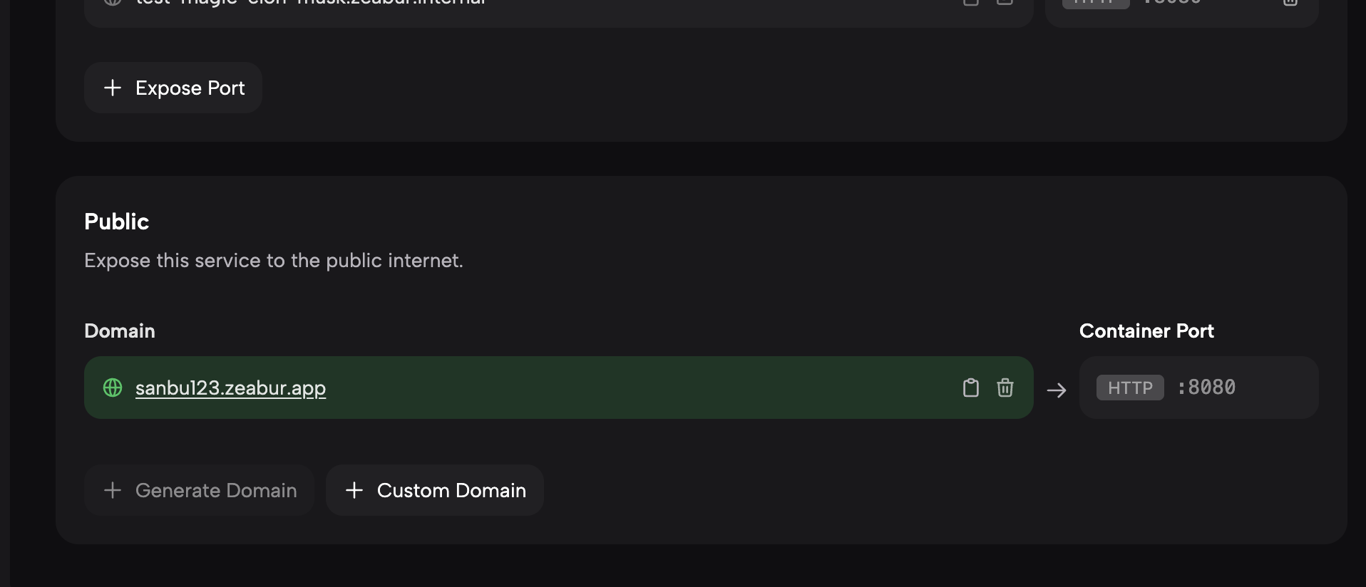 点击左侧的 “Network” 选项,在页面中找到 “Public Address” 区域。点击 “Generate Domain”,即可生成一个对外访问地址,你可以输入任意喜欢的名称。