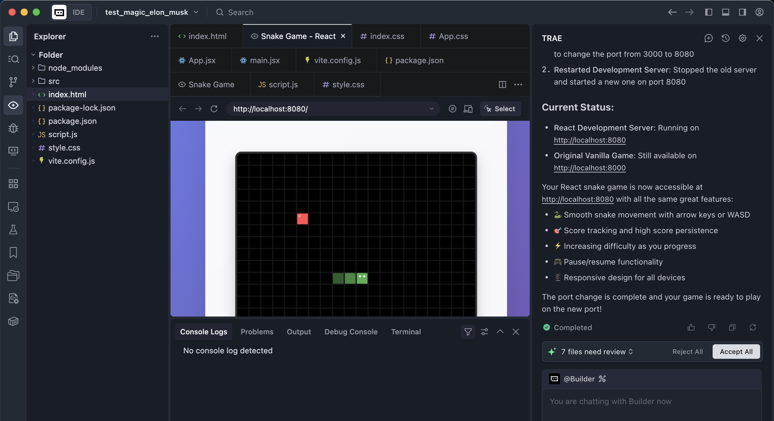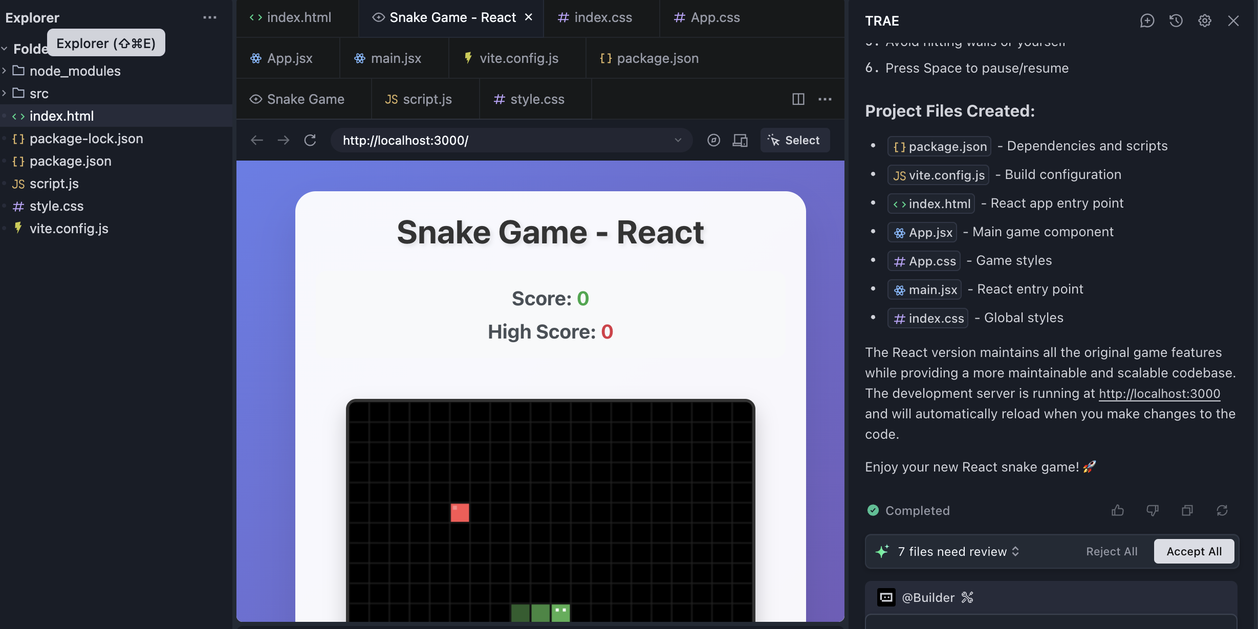 在 Trae 中,你只需要向 Agent 说明:“帮我把这份代码重构成 React 架构”,就可以比较轻松地把原本基于 HTML 的结构重构成 React 项目。