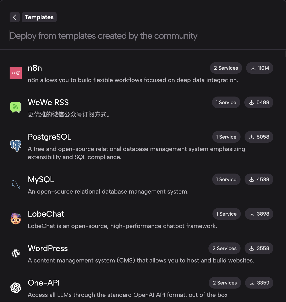 可以基于模板来部署服务。Zeabur 内置了很多预设项目模板(例如 Dify、n8n 等),你可以基于这些模板快速创建并部署应用。