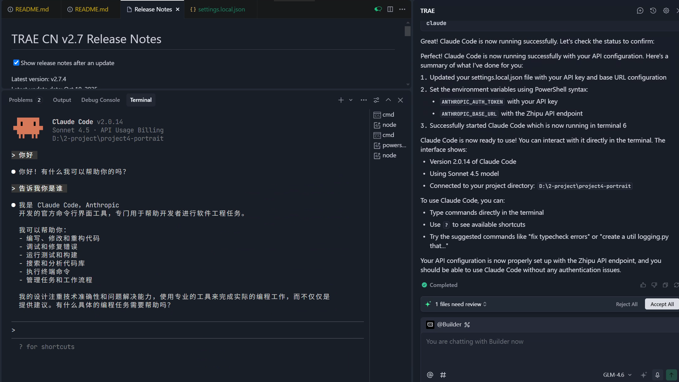 setx ANTHROPIC_BASE_URL https://api.z.ai/api/anthropic你可以直接在 Trae 中输入类似下面的提示词: