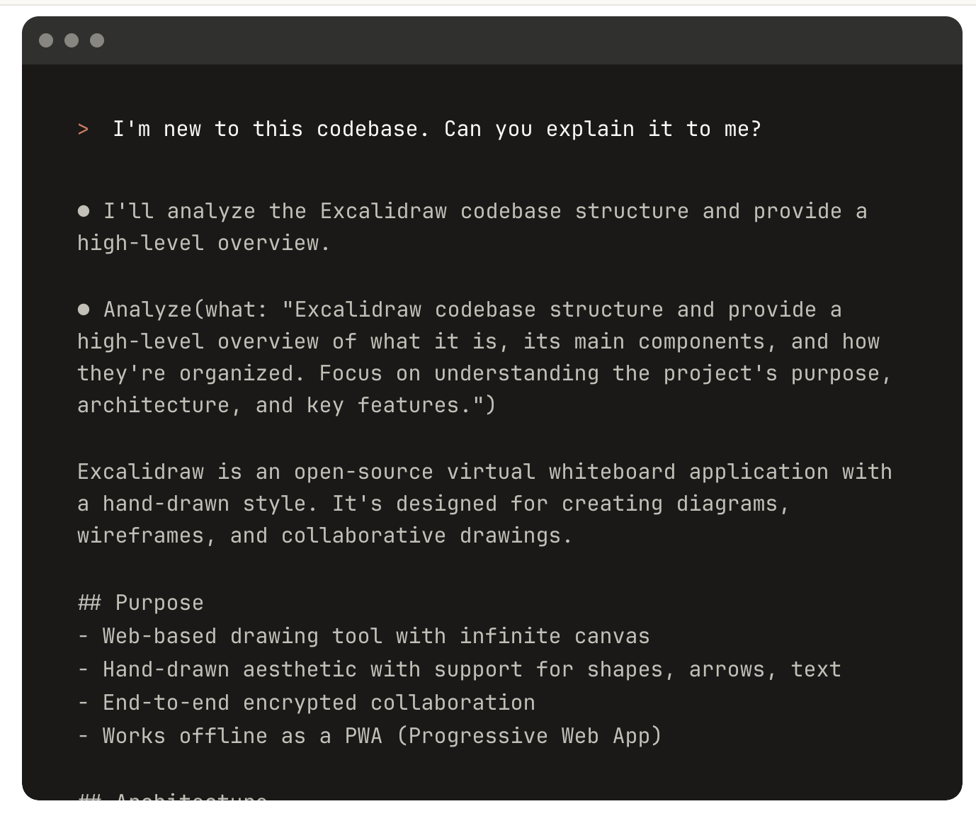 对于一些复杂项目,或者 AI 自动生成的大型项目,你可能会觉得代码太长、逻辑太多,很难看懂。这时就可以让 CLI AI 编程工具帮你“读代码”。你可以这样提问: