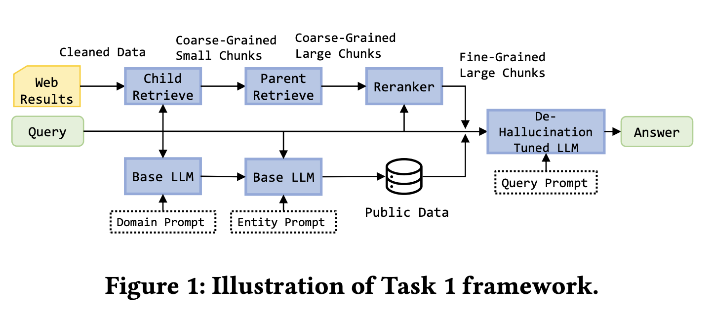 北大db3团队针对任务1设计了精细化的Web数据处理流程。使用BeautifulSoup提取网页文本,ParentDocumentRetriever管理父子块关系(子块200 token用于检索、父块500-2000 token用于生成),确保检索准确性和生成完整性。嵌入模型选用bge-base-en-v1.5,向量库使用Chroma,重排序采用bge-reranker-v2-m3。团队还补充了电影、金融等领域的公开数据(比如IMDB电影数据、上市公司财报),转换为规范格式后入库。模型层面使用LoRA微调Llama-3-8B-instruct,训练数据包括无效问题标注(比如"今天天气怎么样"这类超出知识库范围的问题)、正确答案等。