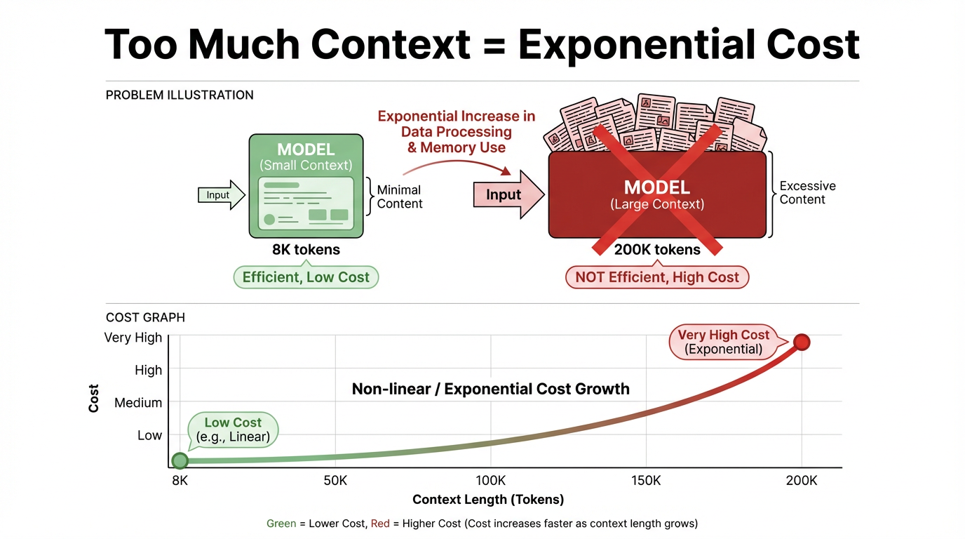计算资源存在大量浪费:绝大多数任务仅需极少量与当前问题高度相关的信息,将全量文档塞入上下文,会造成严重的计算资源闲置与浪费,进而降低系统吞吐量,拖慢响应速度,最终影响用户体验。