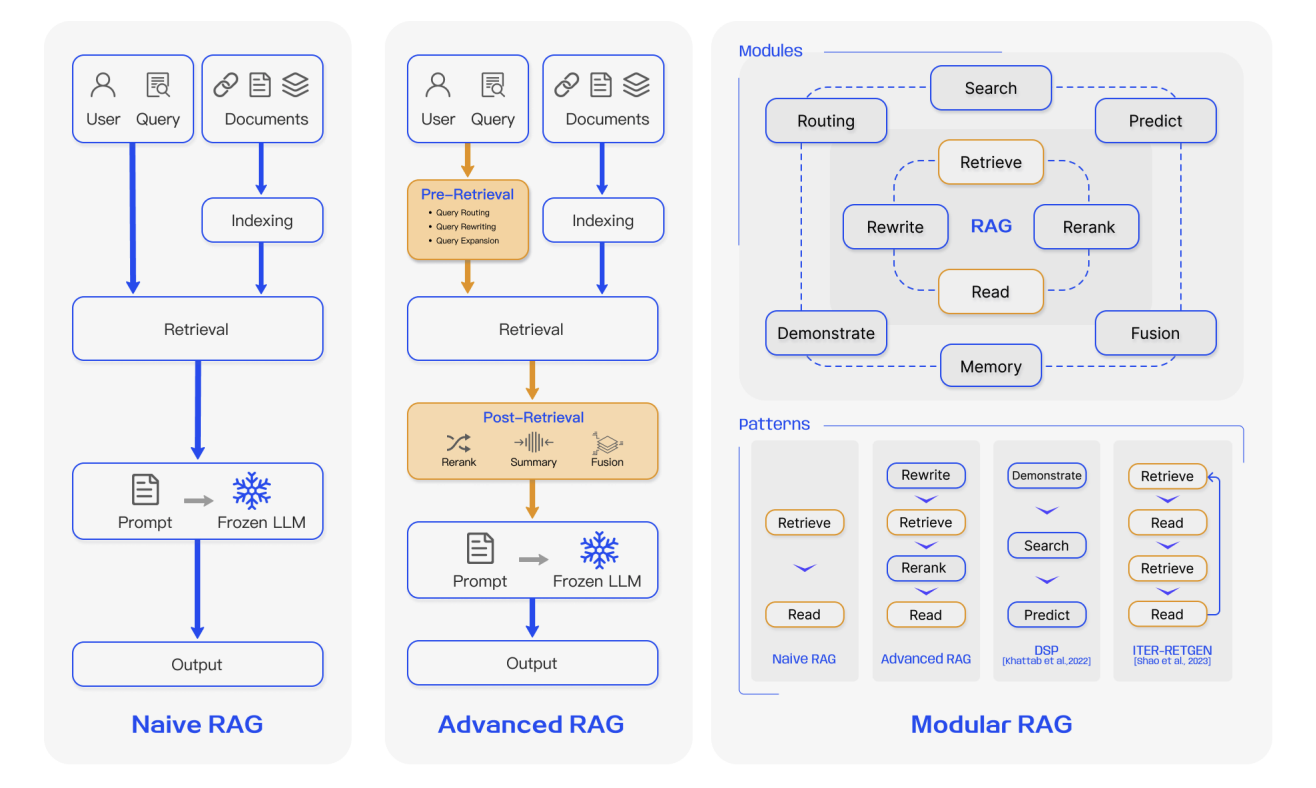 - RAG的技术演进脉络:从基础的Naive RAG到Advanced RAG再到模块化的Modular RAG